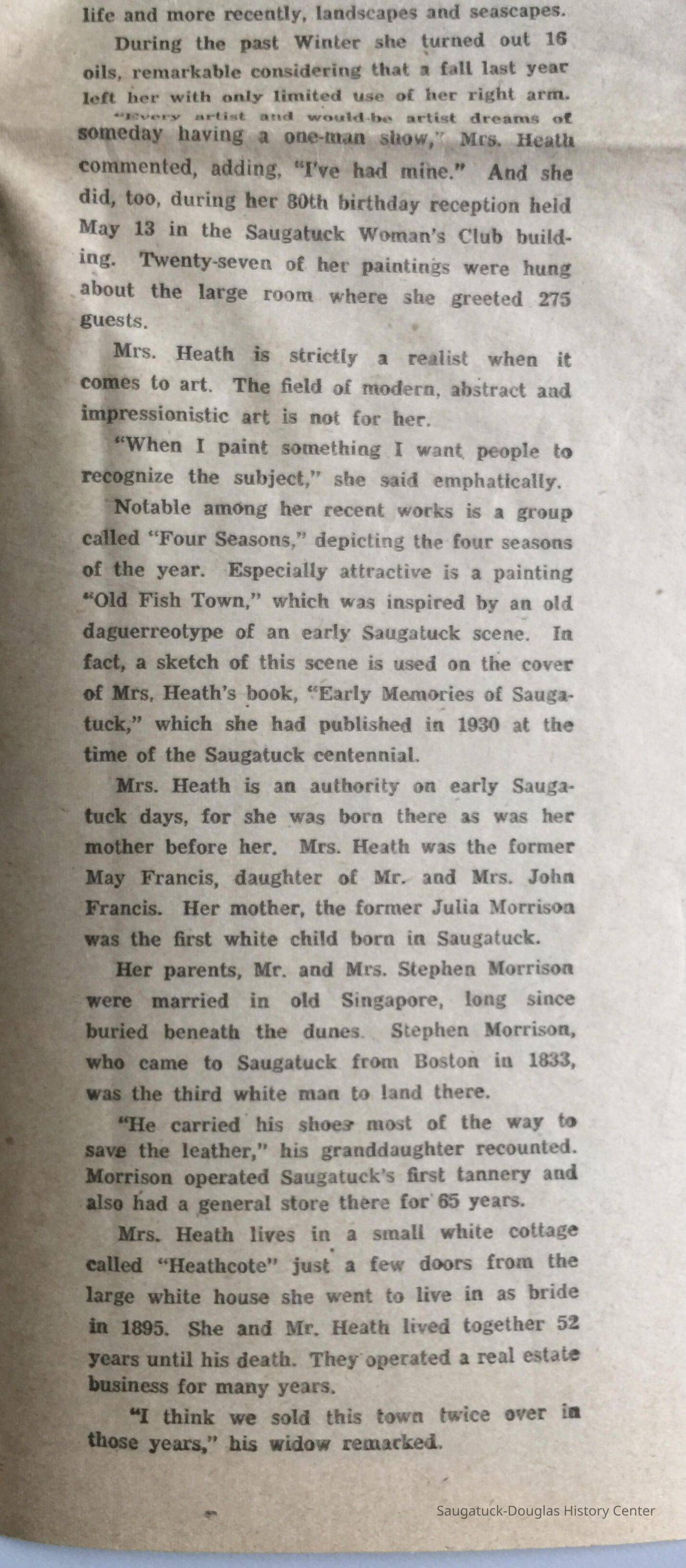 Article covers the late blossoming of a Saugatuck artist, Mrs. D. A. Heath (May Francis Heath), who only picked up the brush at age 78 when she took an art class in Lake Worth, Florida, where she winters. Second half of article mentions her authorship of "Early Memories of Saugatuck" and her pedigree as the child of early white settlers.