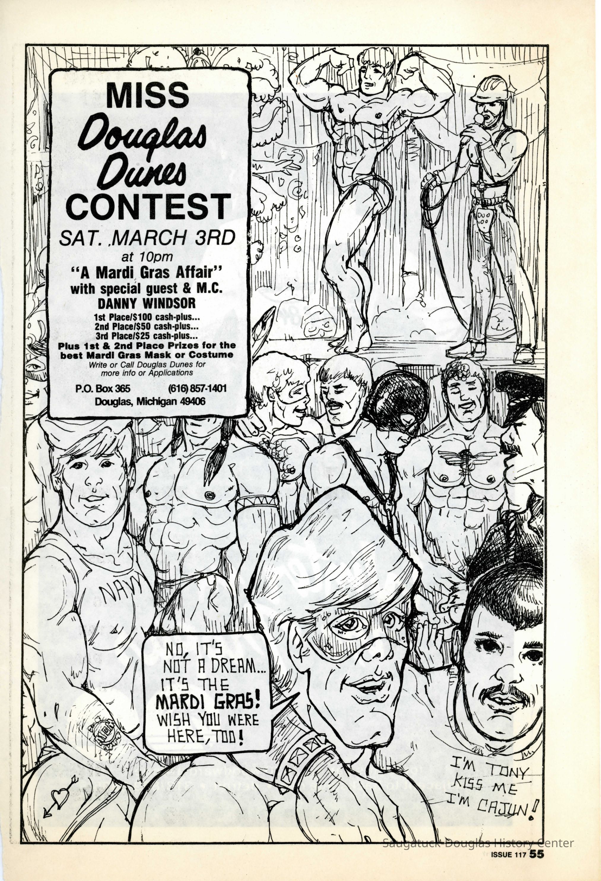 An advertisement for the Miss Douglas Dunes Contest on Saturday, March 3 using comic book style illustration.