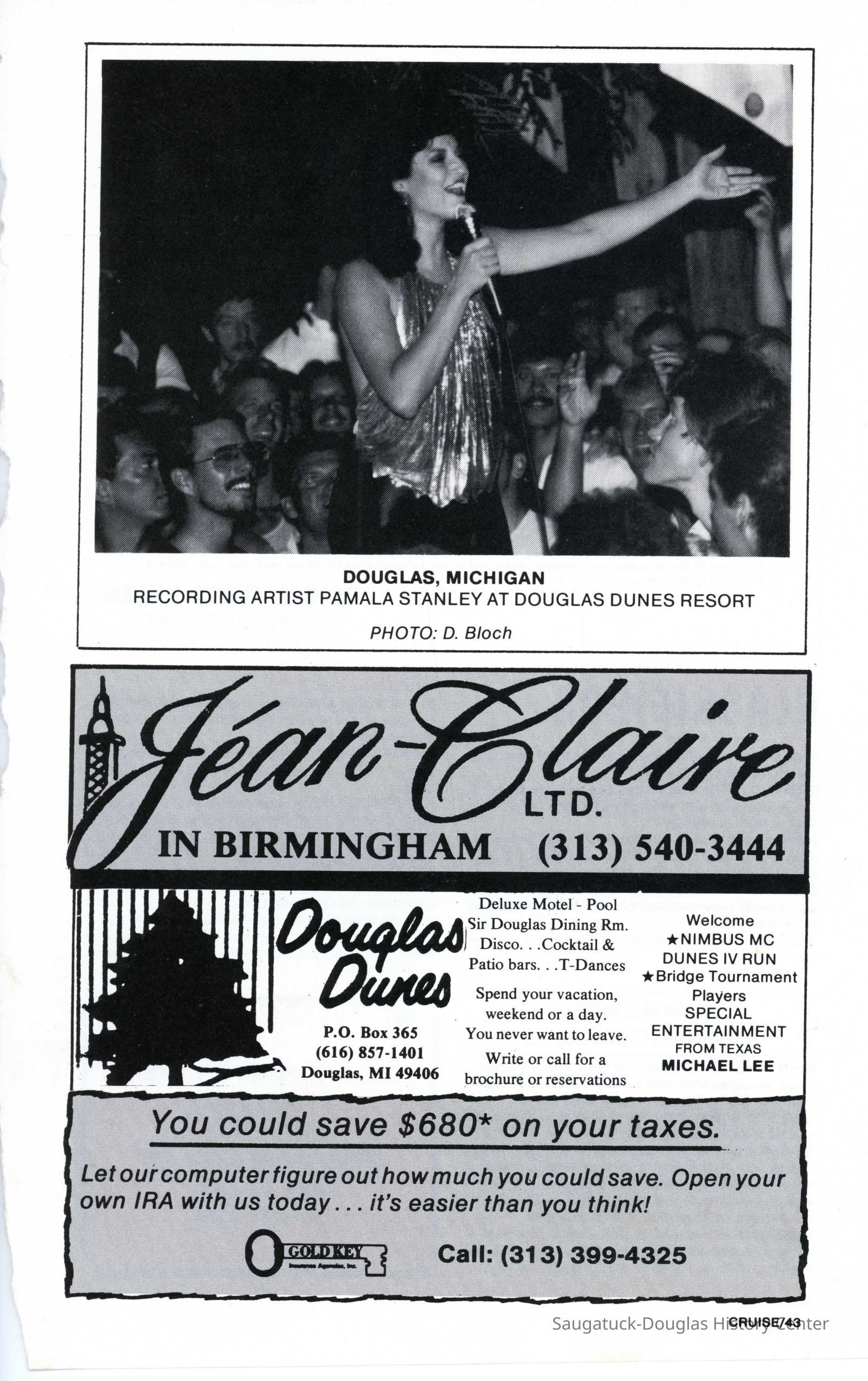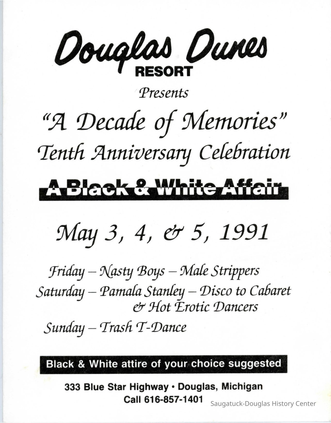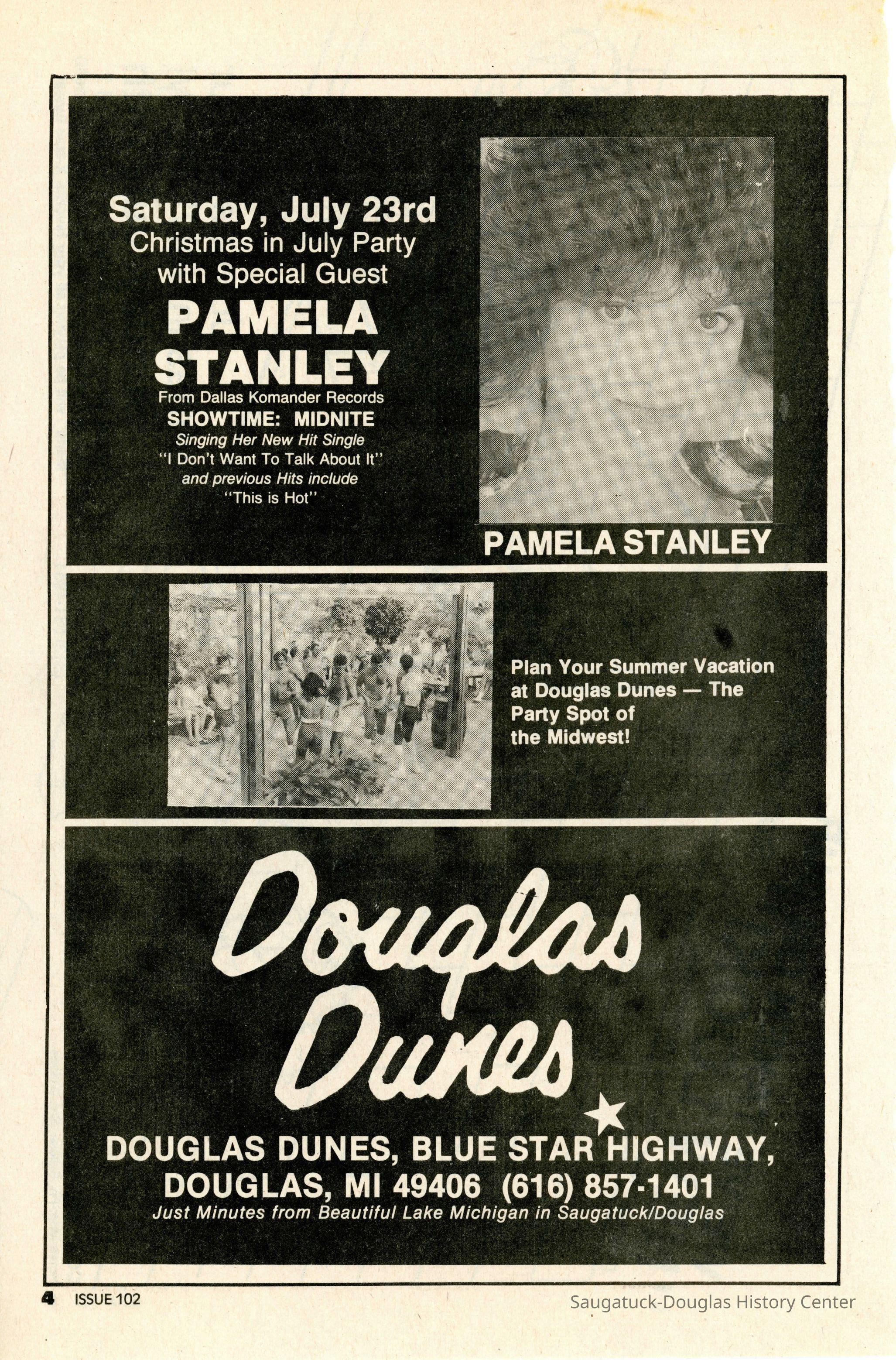 An advertisement in Metra magazine for Douglas Dunes. It advertises "Hot Men, Beach Parties, Pina Coladas, Memorial Day with Pamala Stanley" and other events.