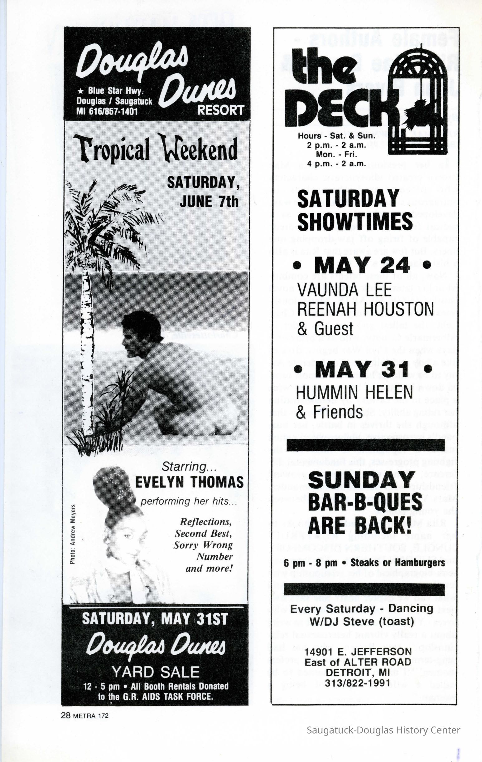 An advertisement in Metra for two events at Douglas Dunes: tropical weekend and the charity yard sale for the Grand Rapids AIDS Task Force.
