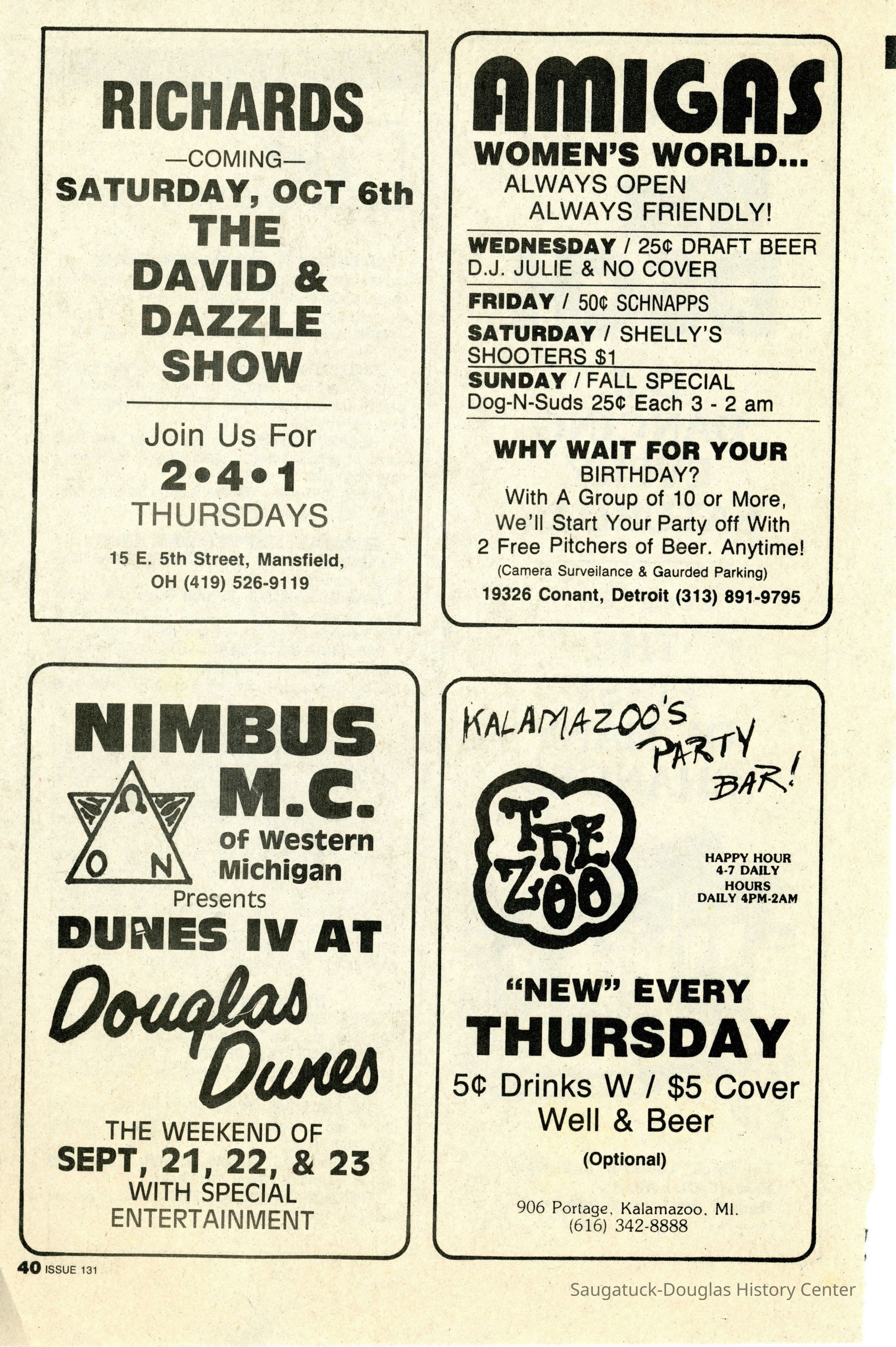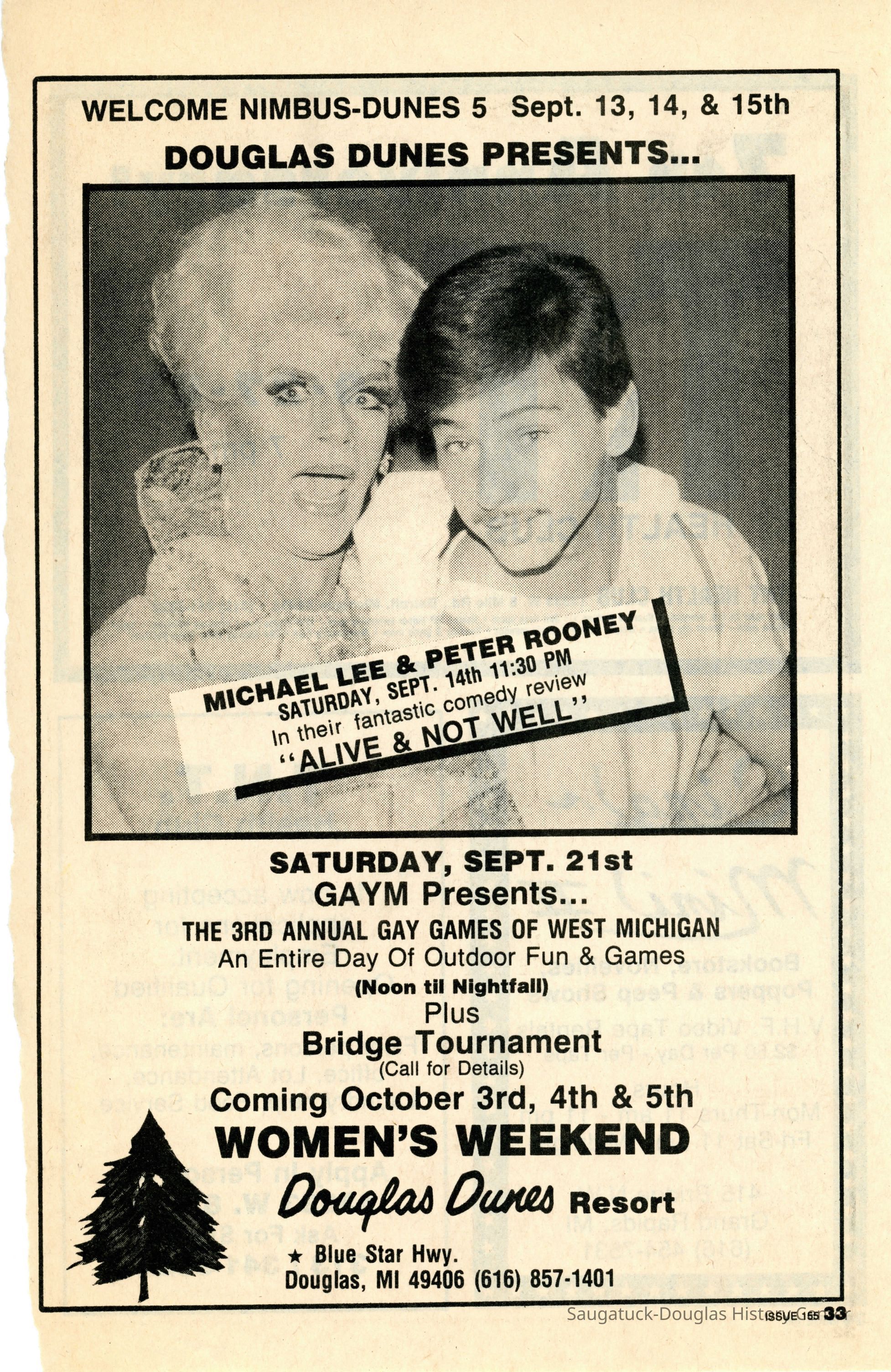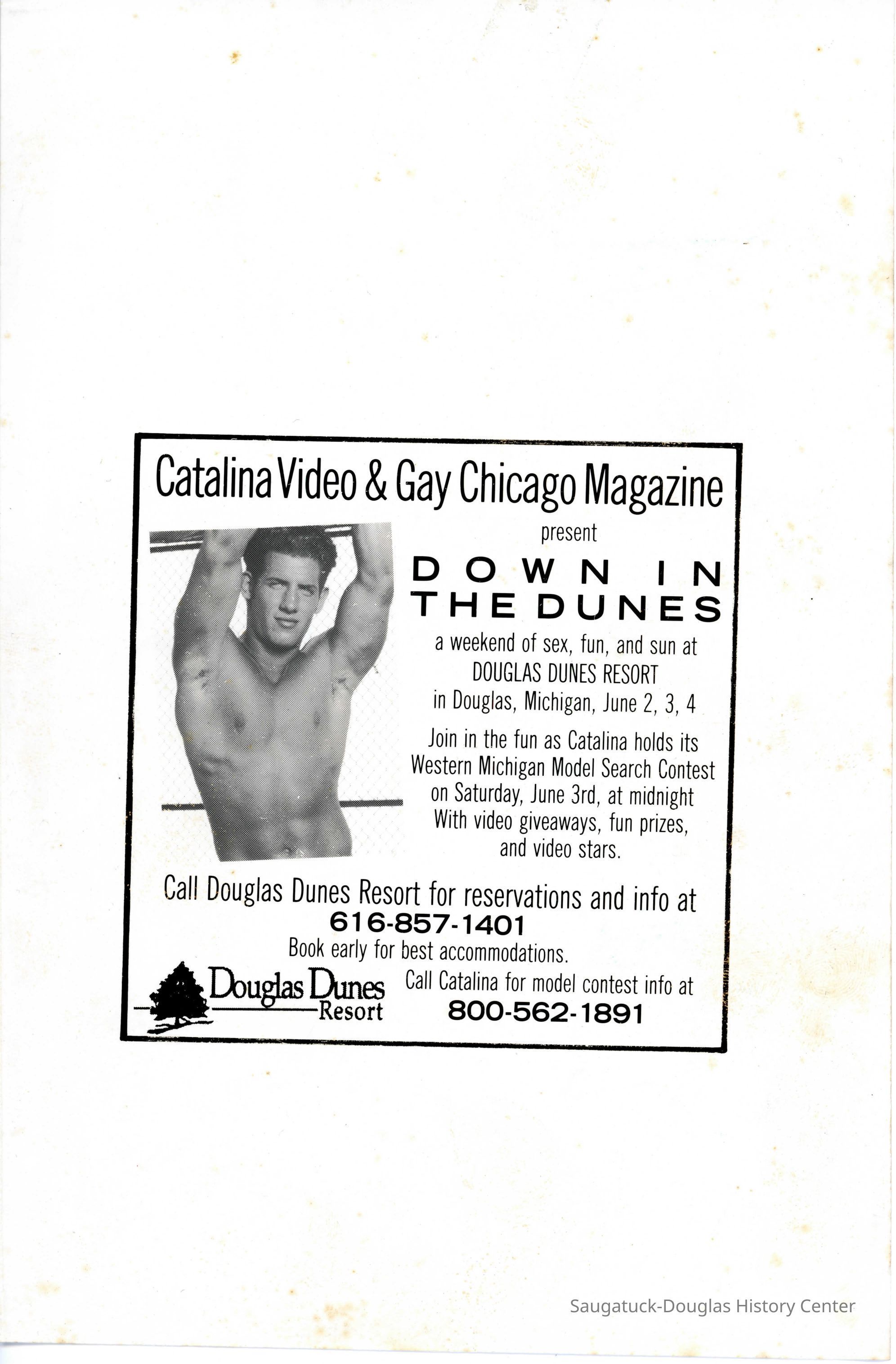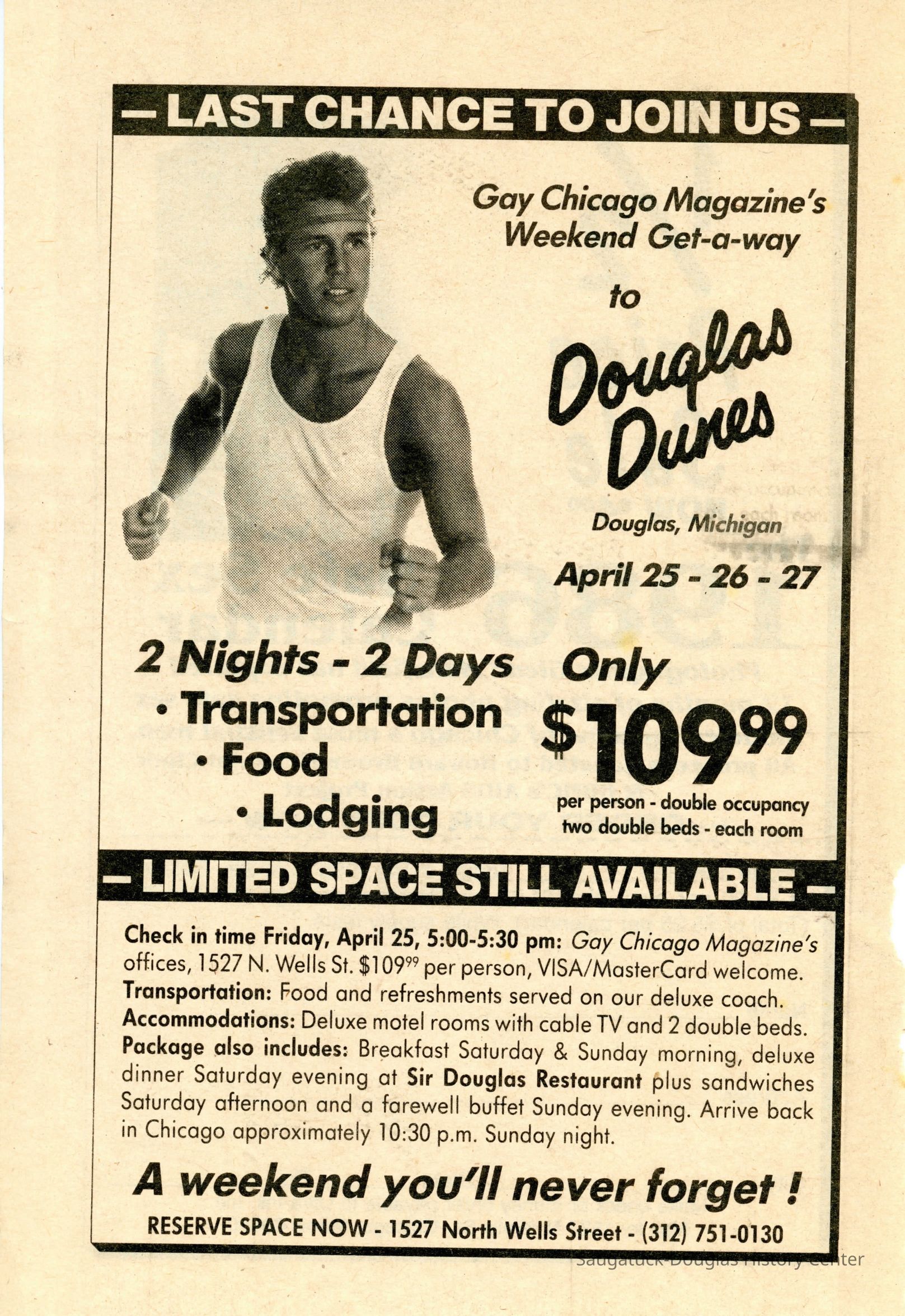 An advertisement in Gay Chicago magazine for a two day get-a-way at Douglas Dunes.