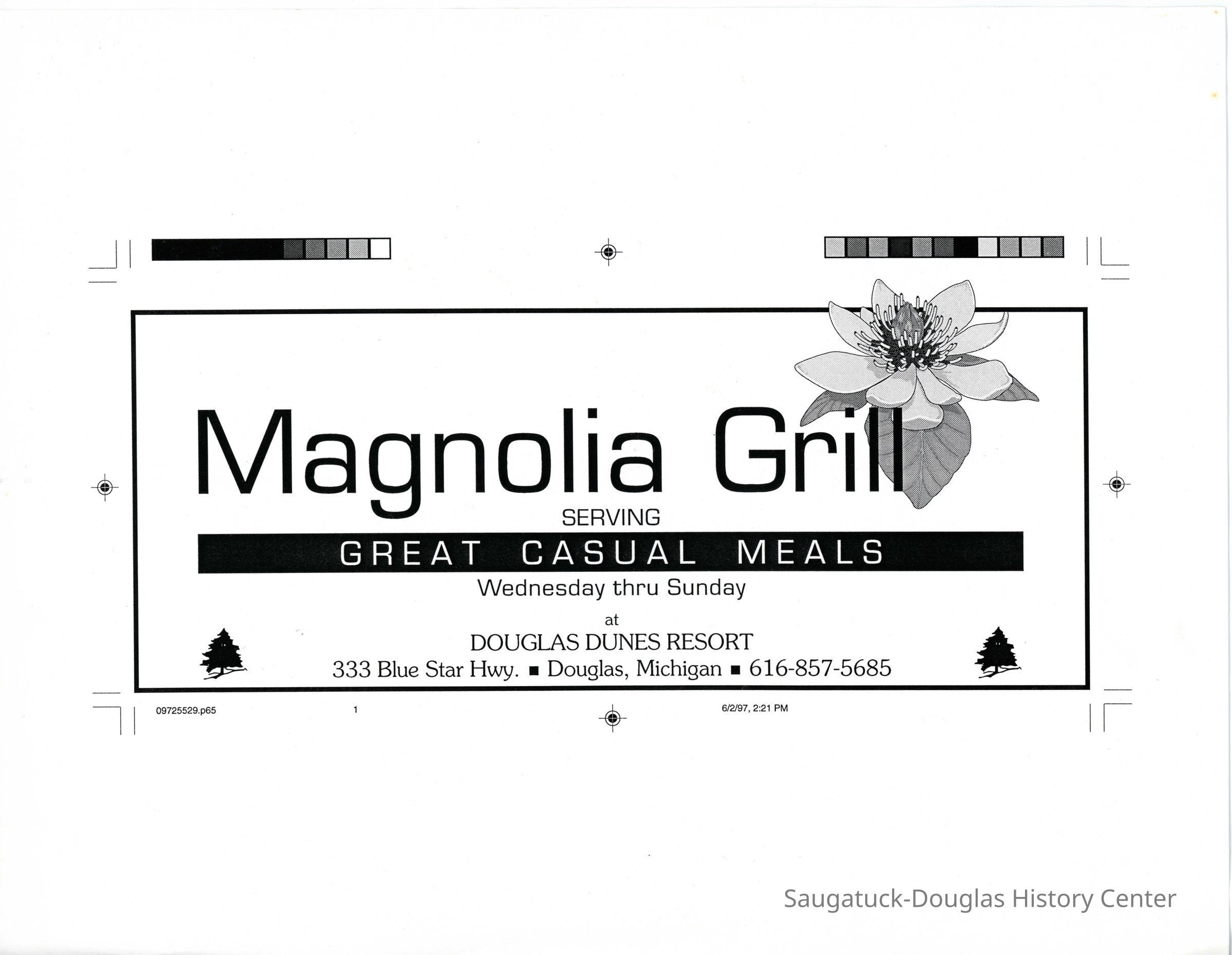 A proof copy for an advertisement for Magnolia Grill at Douglas Dunes.