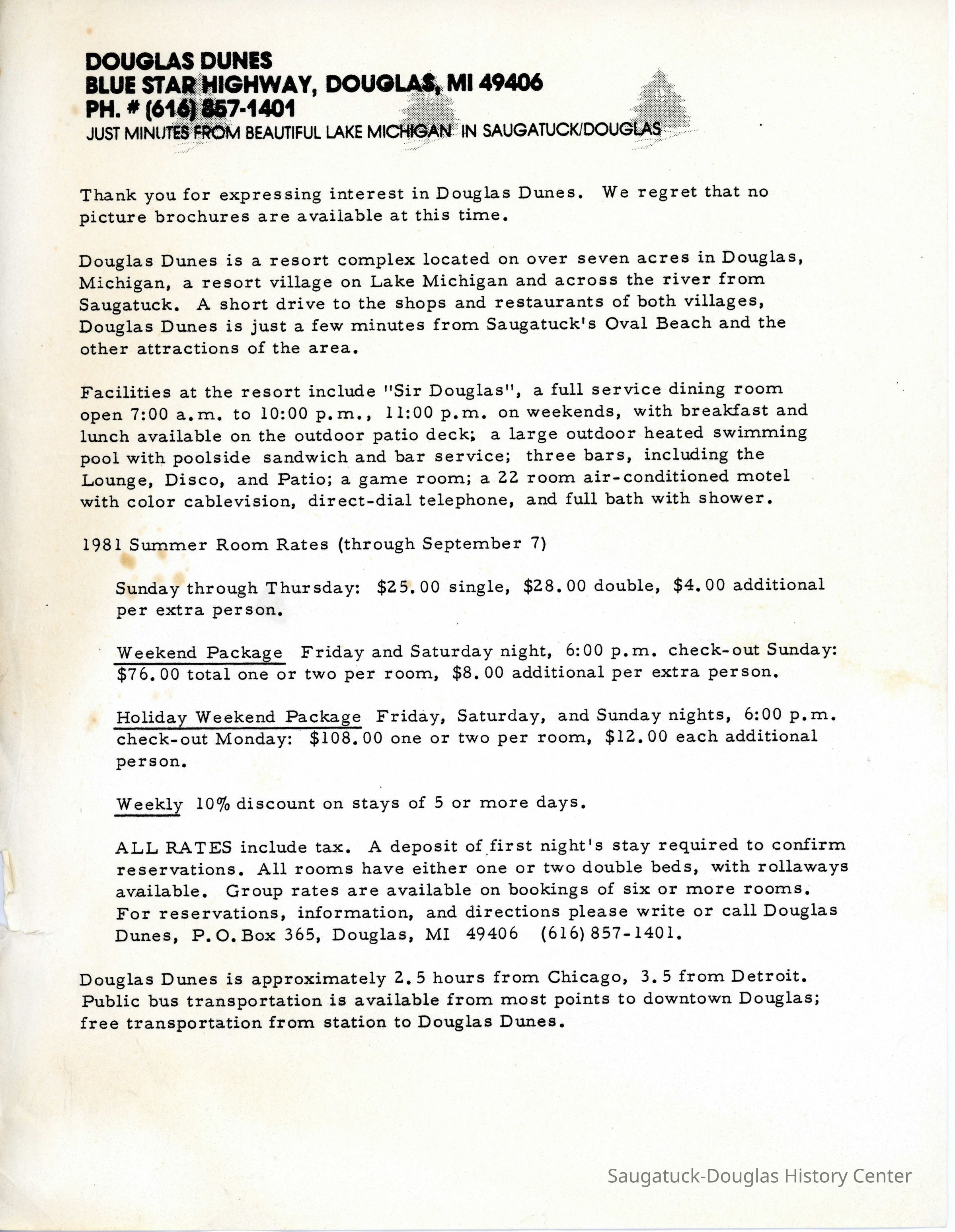 An informational letter explaining the location, facilities, and rates of Douglas Dunes.