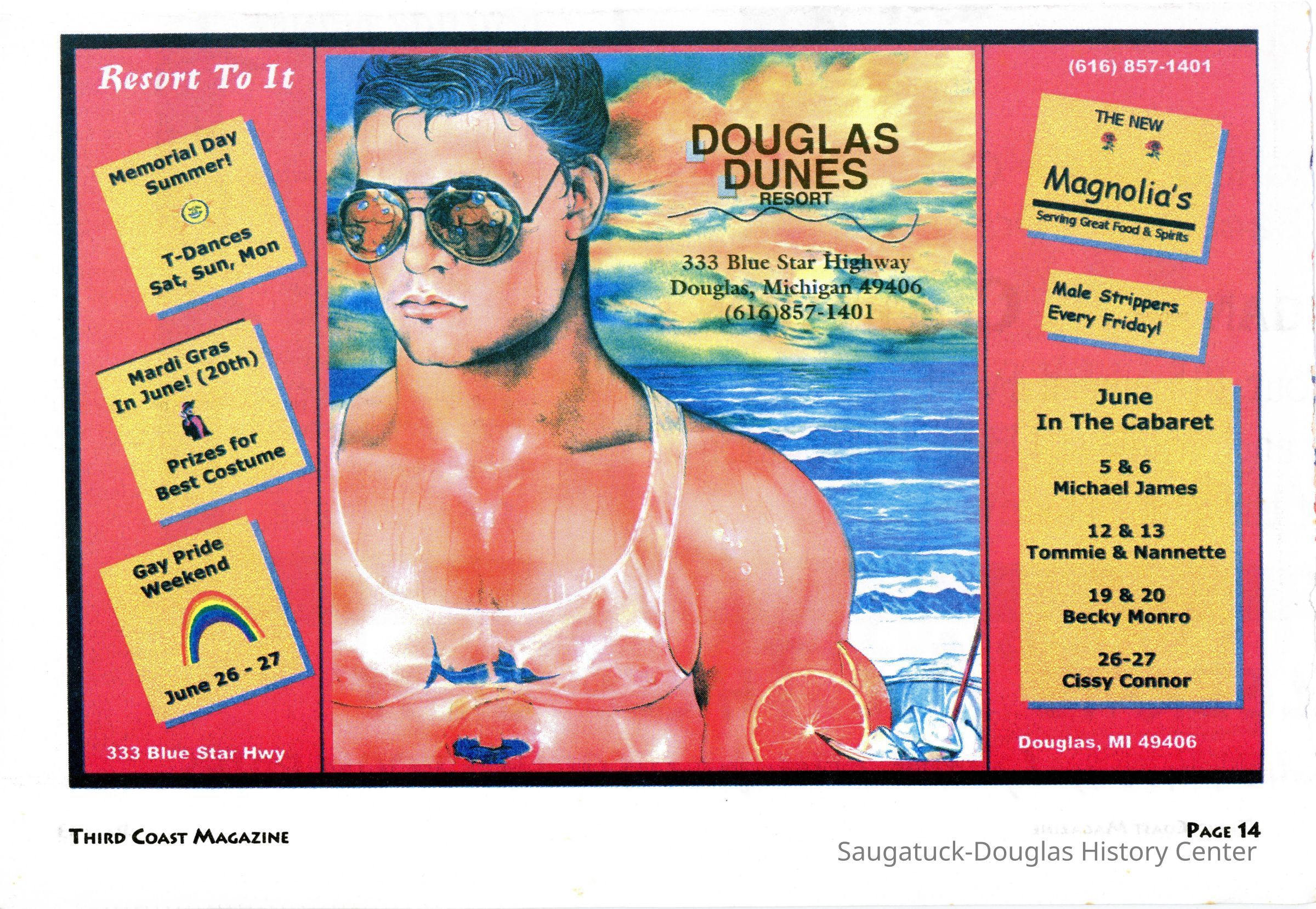 An advertisement for Douglas Dunes in Third Coast Magazine. It mentions Mardi Gras in June, Gay Pride Weekend, June in the Cabaret, T-Dances, and Magnolia's.