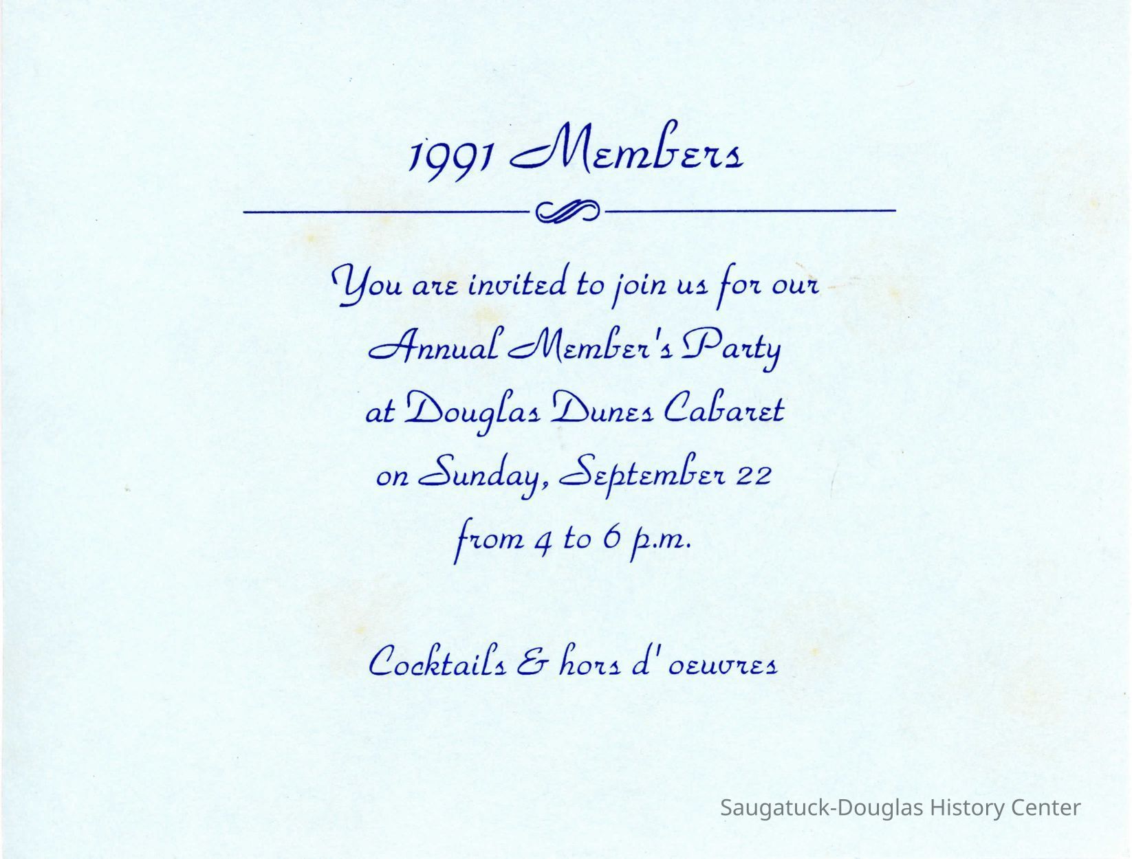 An invitation to the 1991 Annual Member's Party on Sunday, September 22.
