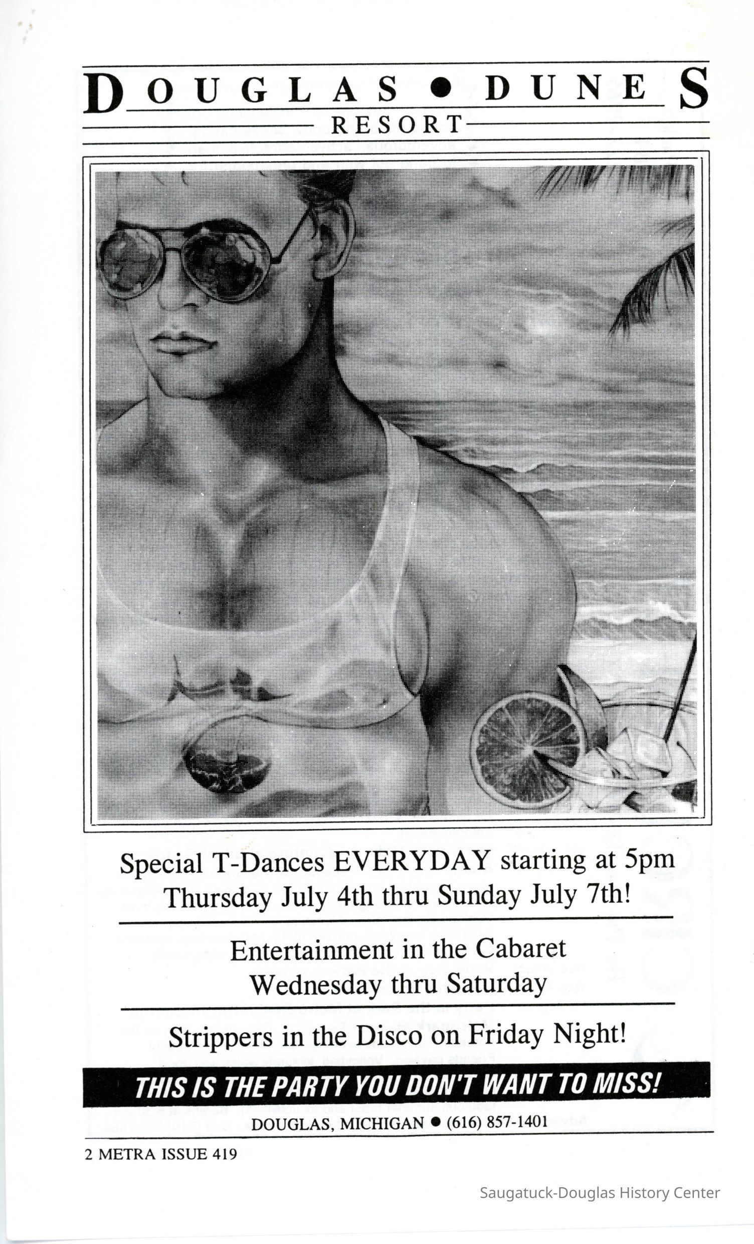 An advertisement in Metra magazine for Douglas Dunes. It describes t-dances, cabaret entertainment, and "Strippers in the Disco on Friday."