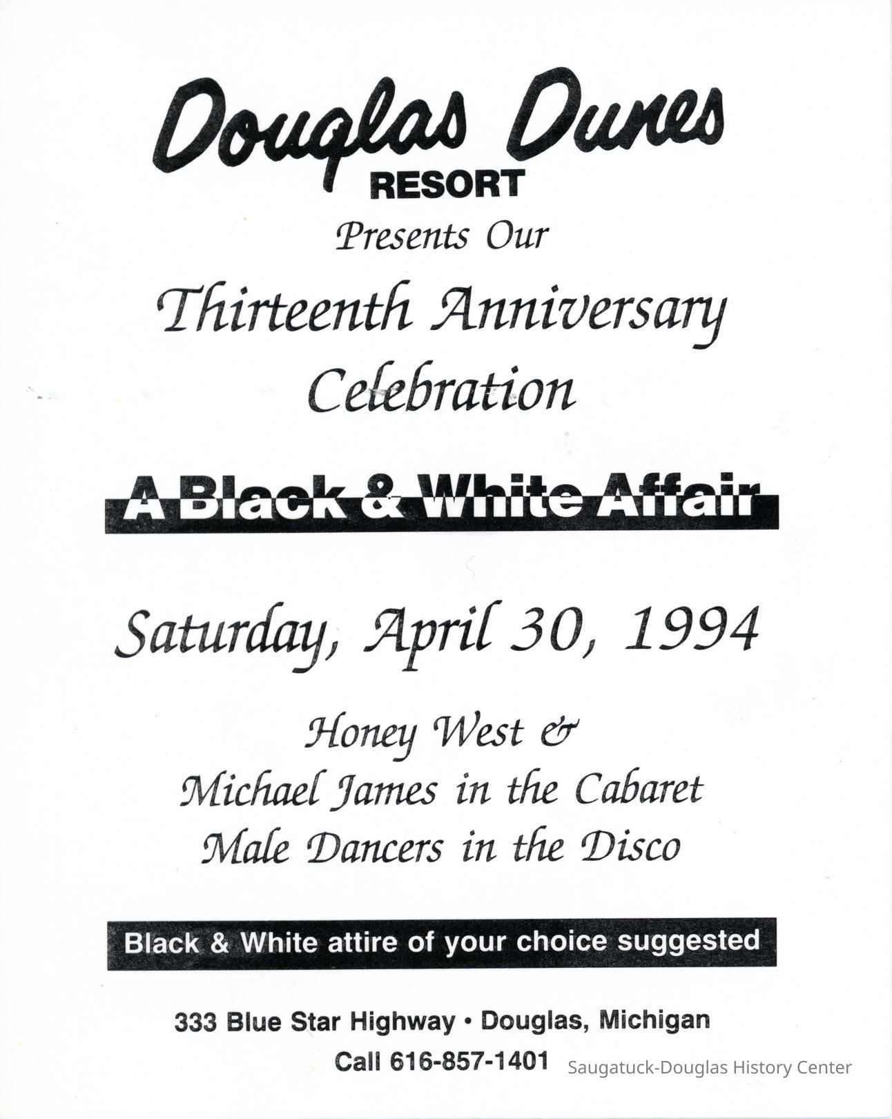 An advertisement for the 13th anniversary party with its perennial theme "A Black & White Affair."