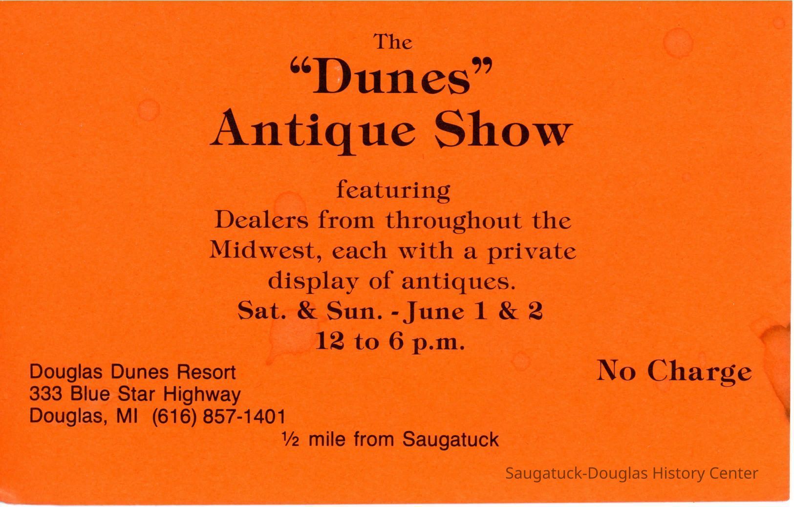 A card advertising for the free "Dunes" Antique Show.