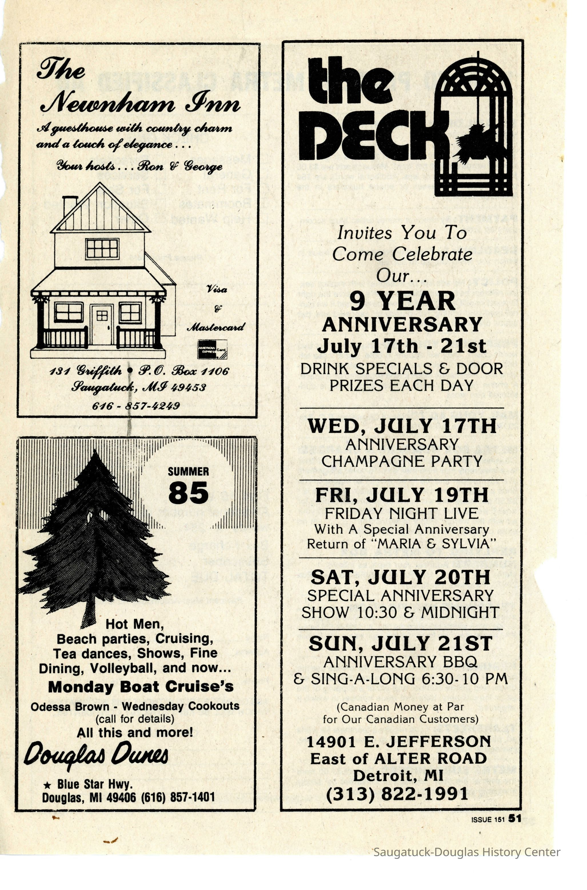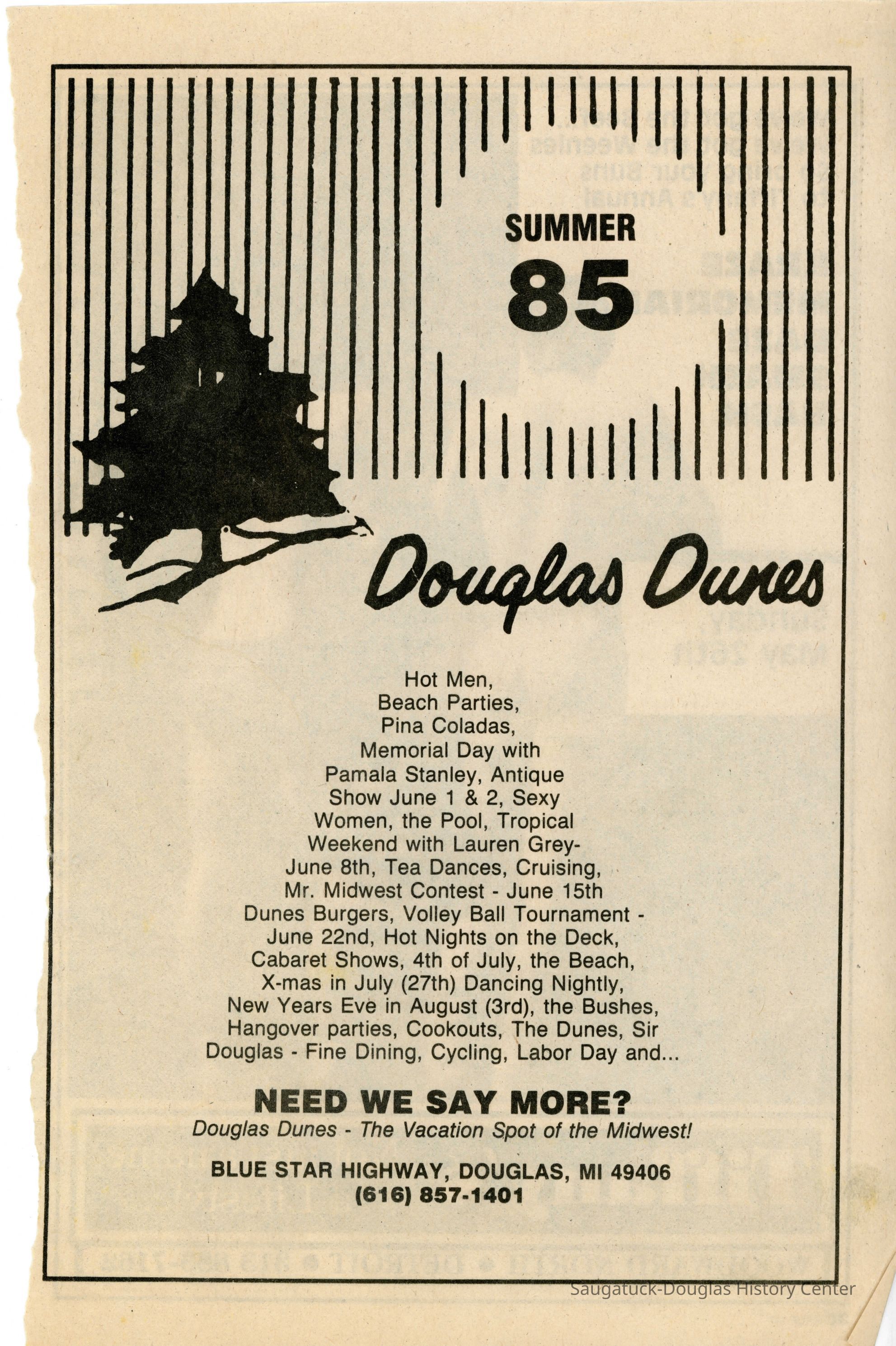 An advertisement for Douglas Dunes in Metra magazine for the summer of 1985. It states "Hot Men, Beach parties, Cruising, Tea dances, Shows, Fine Dining, Volleyball, and now... Monday Boat Cruise's [sic]."