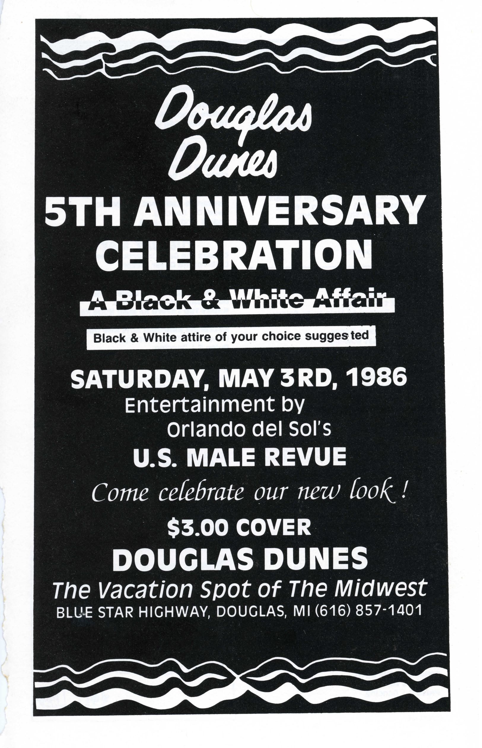 An advertisement in Cruise magazine for the 4th anniversary of Douglas Dunes with the perennial theme of "A Black & White Affair."