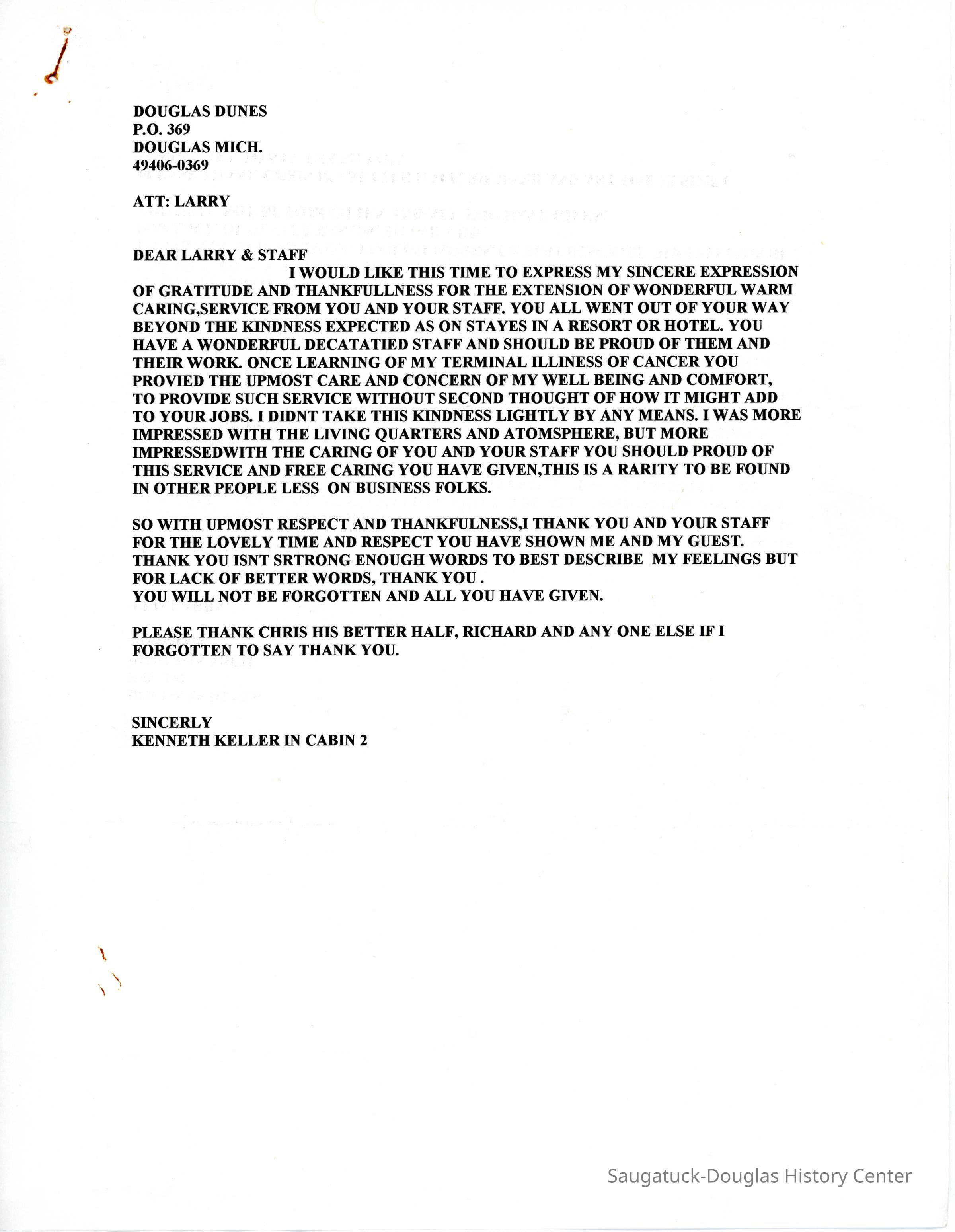 A letter from Kenneth Keller expressing gratitude for the excellent service he received at Douglas Dunes.