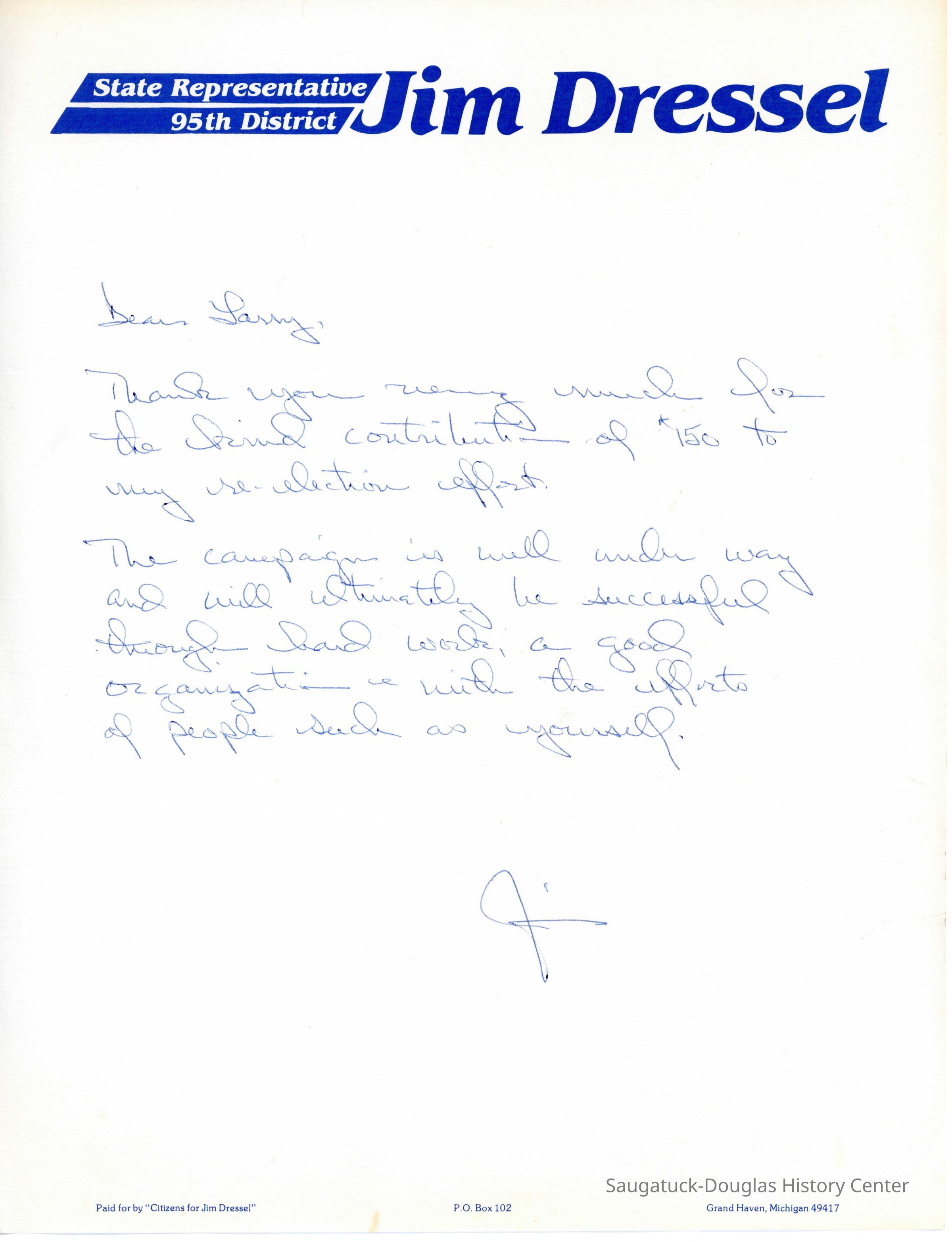 A letter from Jim Dressel on his letterhead that thanks Larry for his contribution to his campaign.