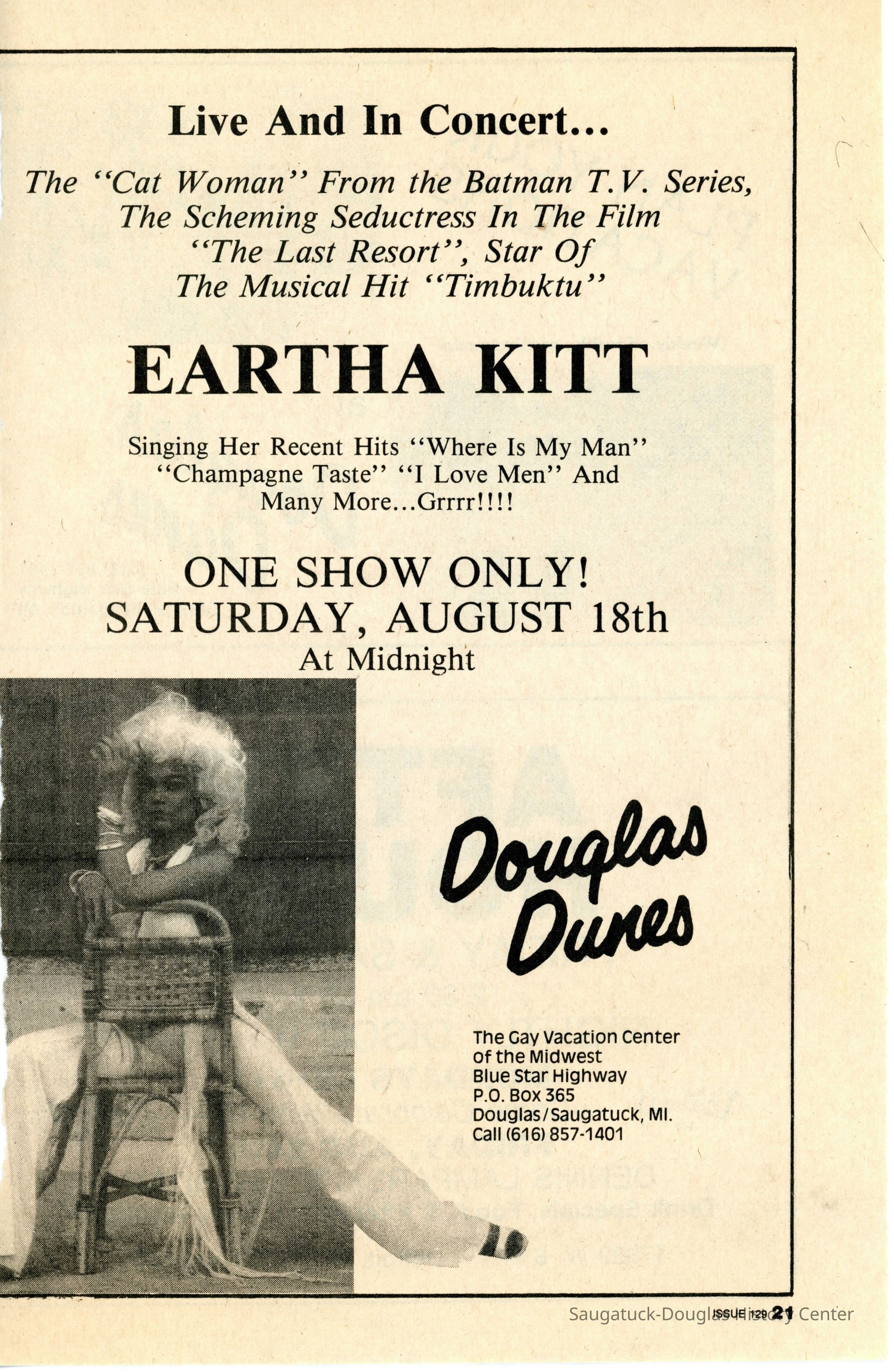 An advertisement in Metra magazine for Eartha Kitt at Douglas Dunes.