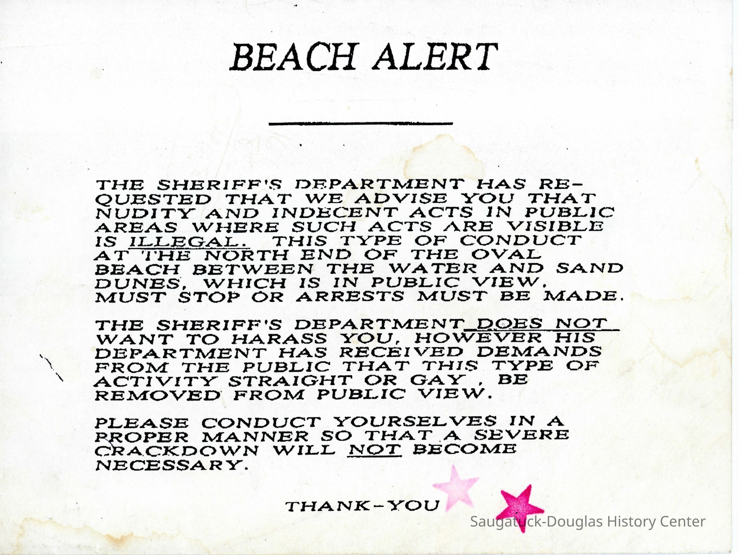 A notice put out at the Sherriff's Department's request stating that "nudity and indecent acts in public areas" are illegal especially north of Oval Beach.