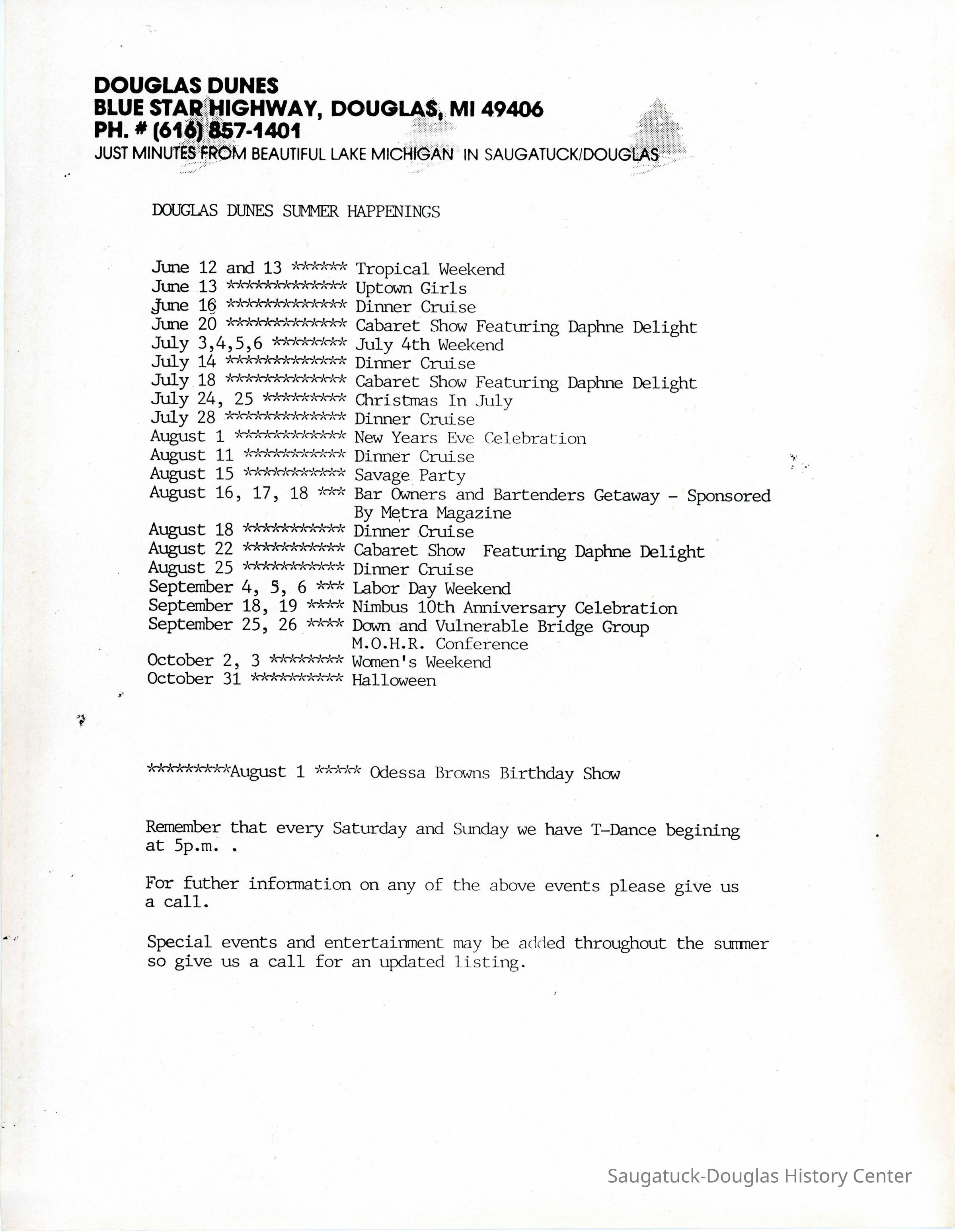An informational letter with a list of the events happening at the Douglas Dunes