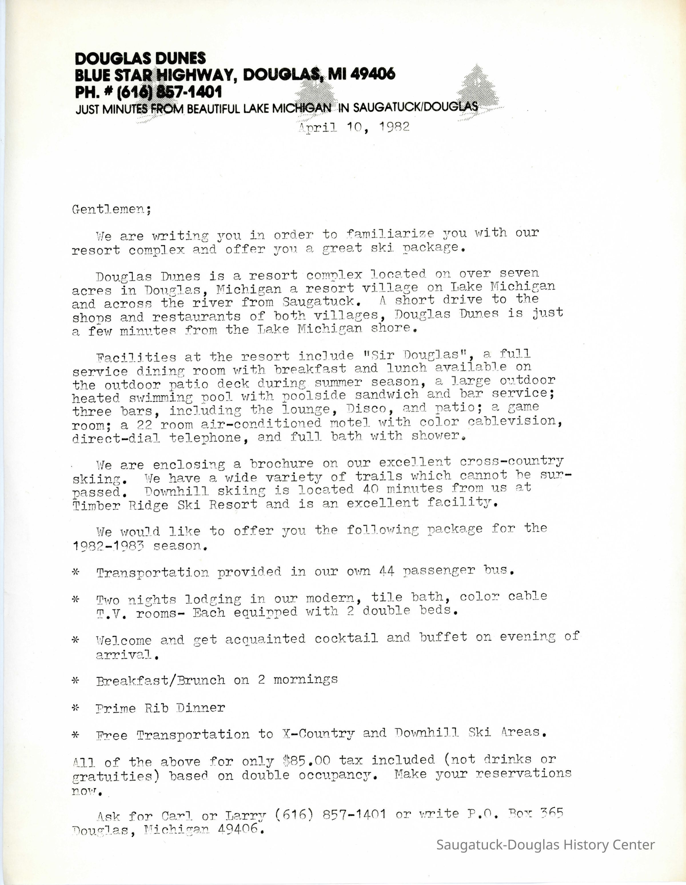 A letter that advertises a skiing package offered by the Douglas Dunes.