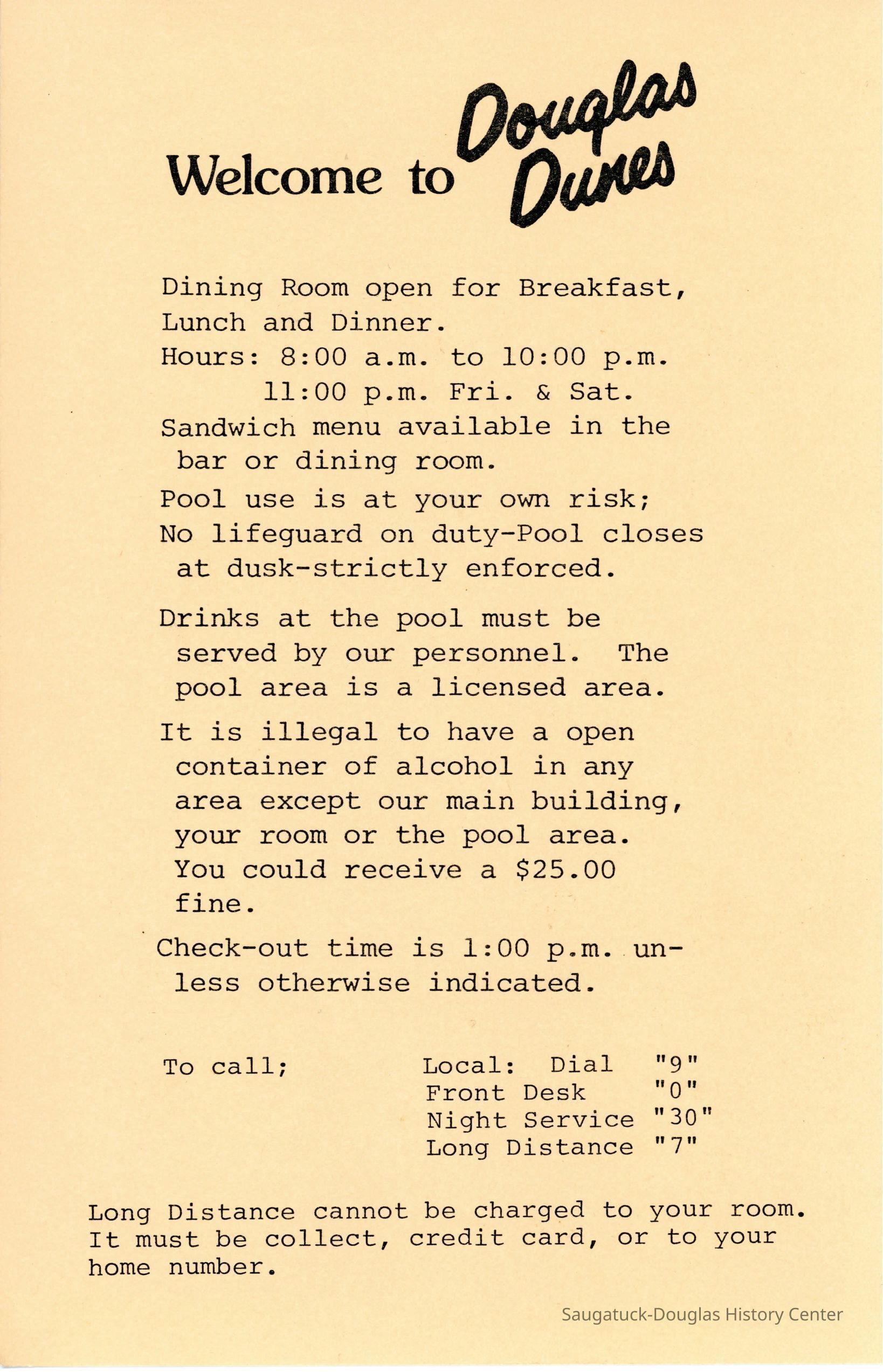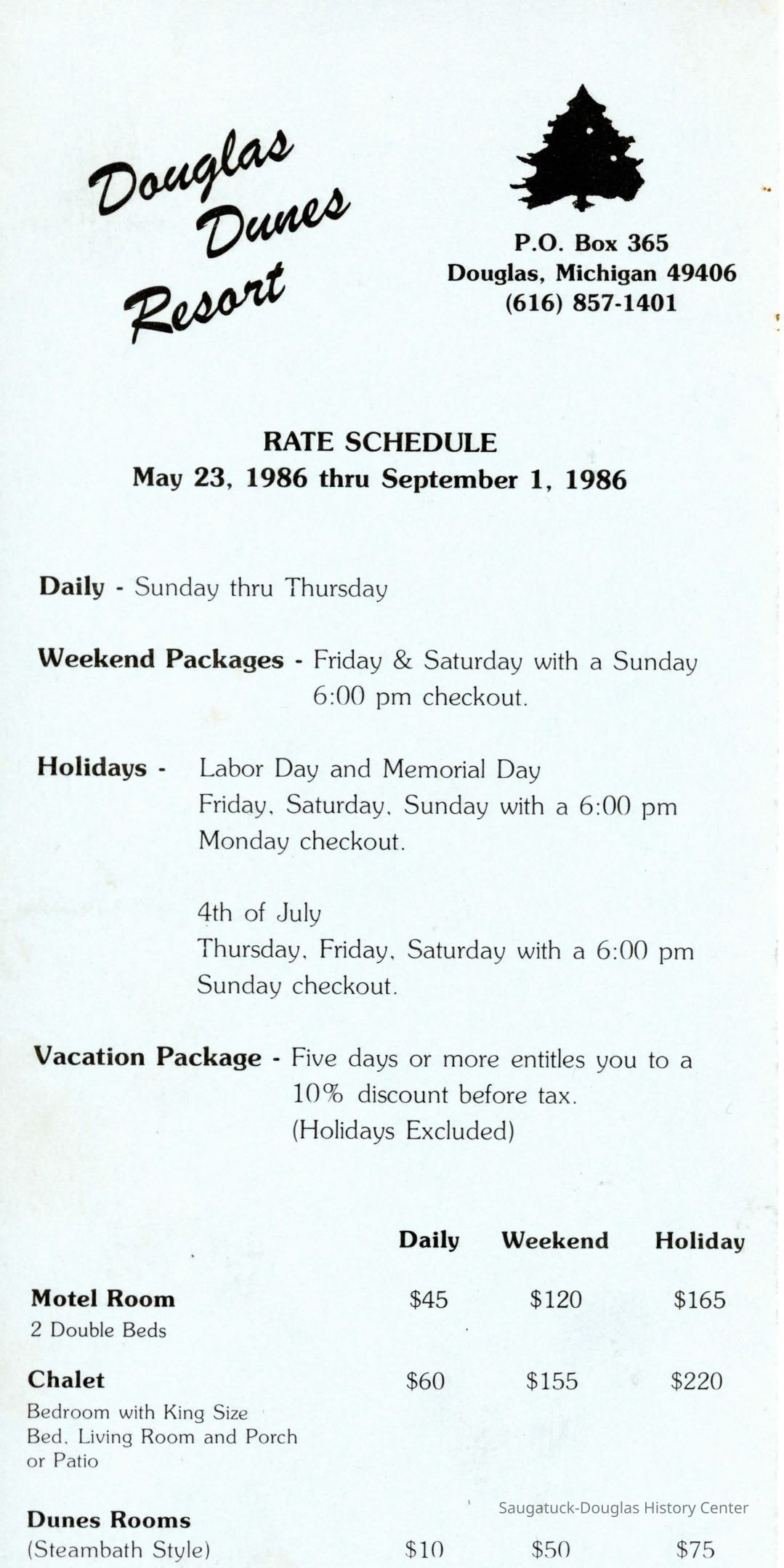 A card with the rate schedule for Douglas Dunes for the 1986 summer season.