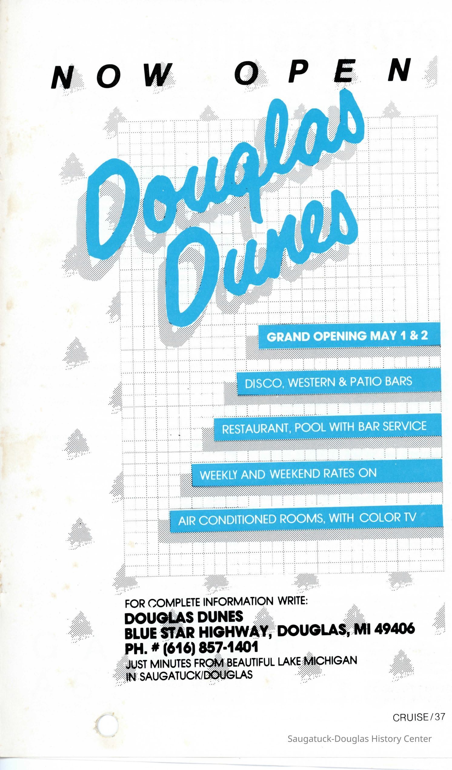 An advertisement in the gay circular Cruise Weekly that promotes the opening of Douglas Dunes.