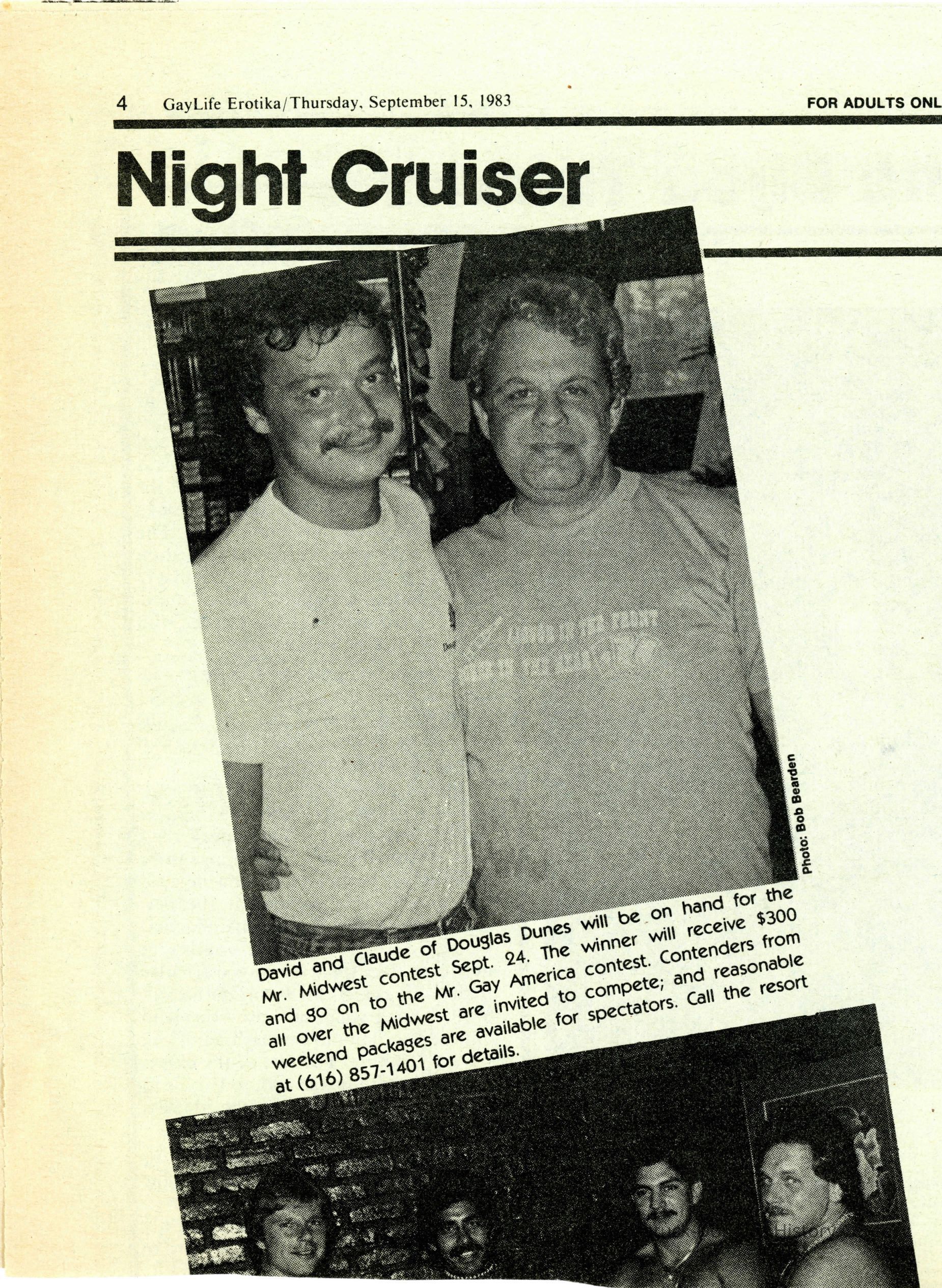 A photo of David and Claude of Douglas Dunes with a caption about the Mr. Midwest Contest on September 24, 1983.