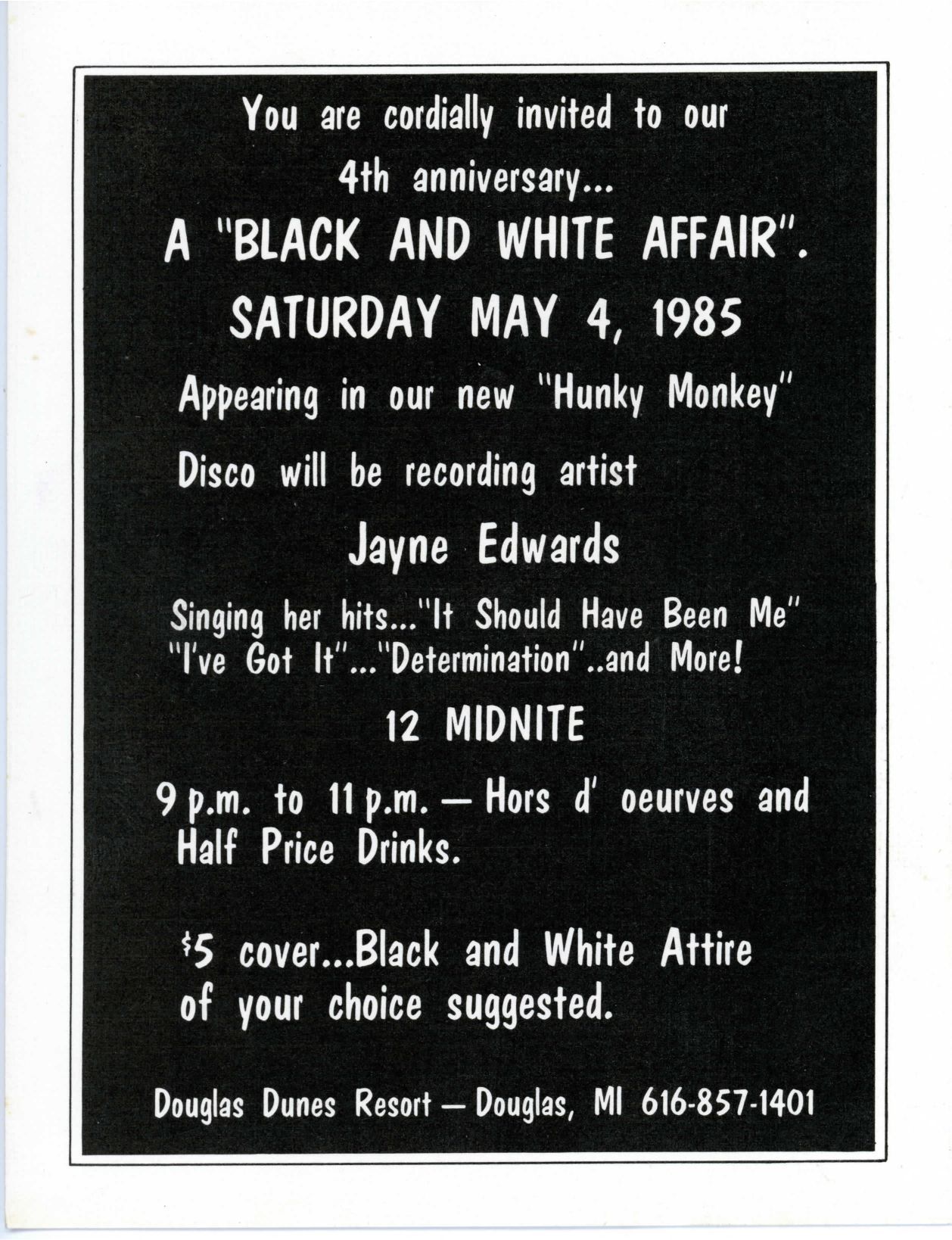 An advertisement for the 5th anniversary party with its perennial theme "A Black & White Affair."