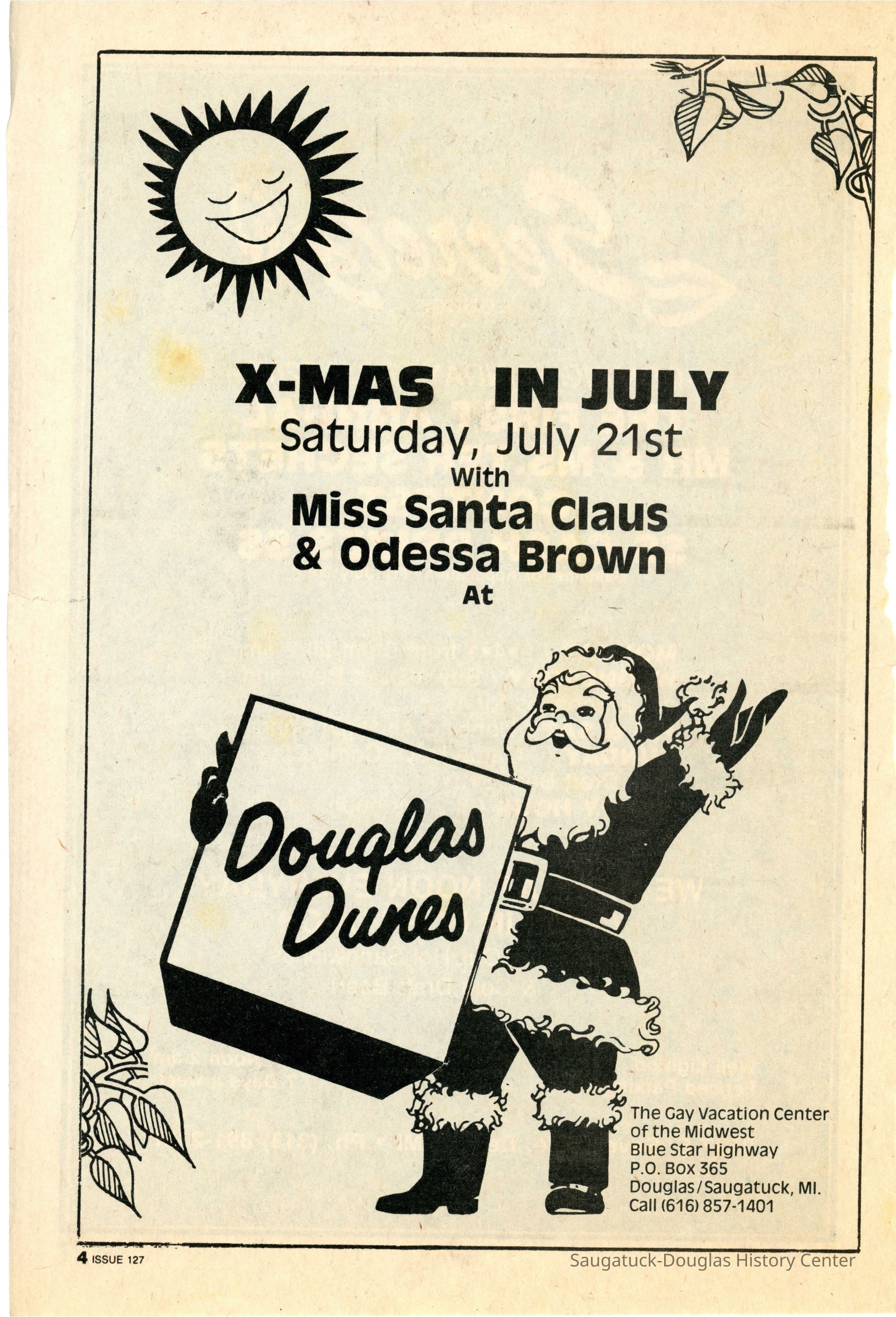 An advertisement in Metra magazine for the Douglas Dune's Christmas party with Odessa Brown as Miss Santa Claus.