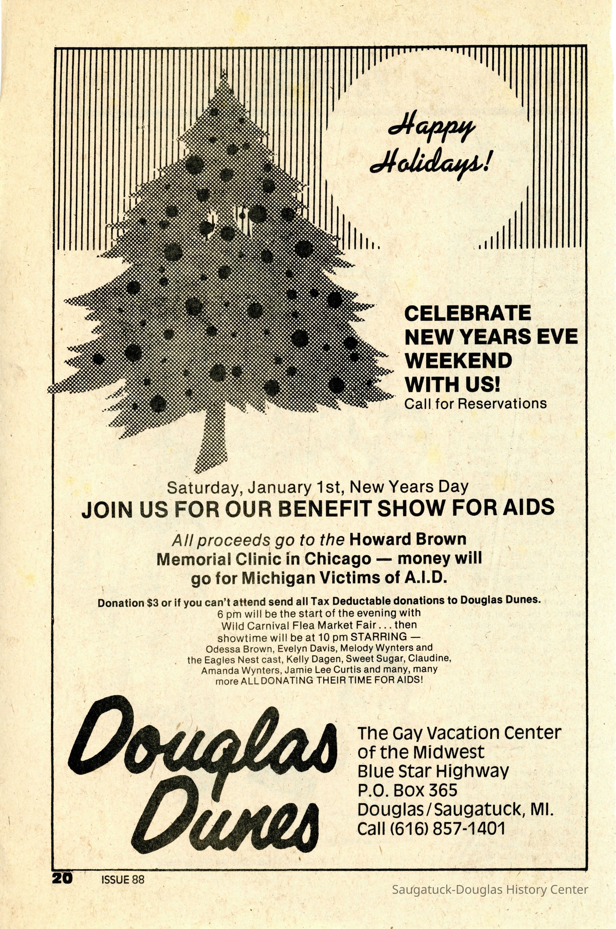 An Advertisement in Metra magazine for Douglas Dunes for the New Years Eve party and the AIDS benefit show.