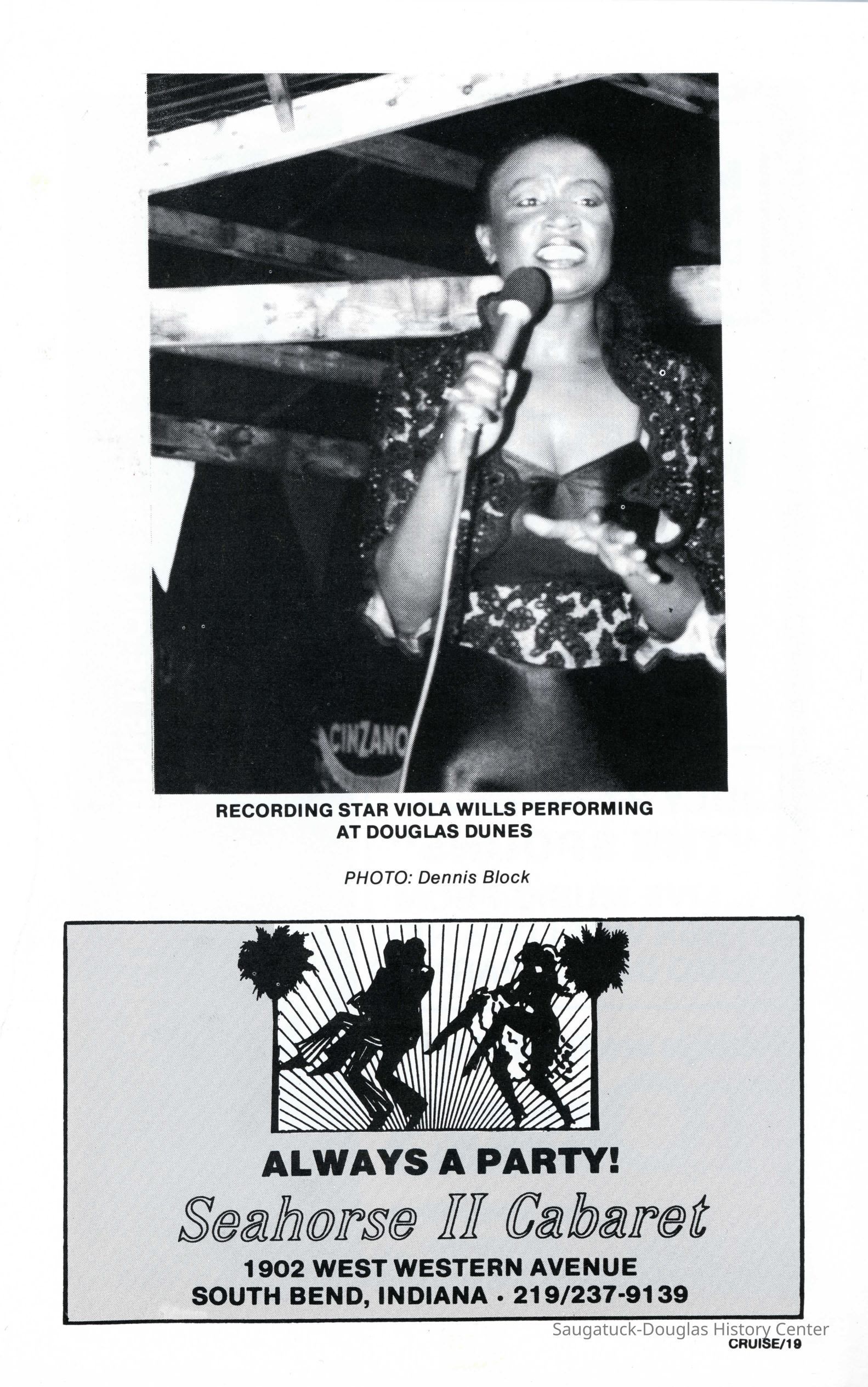 An photograph by Dennis Block of Viola Wills singing at Douglas Dunes in Cruise magazine.