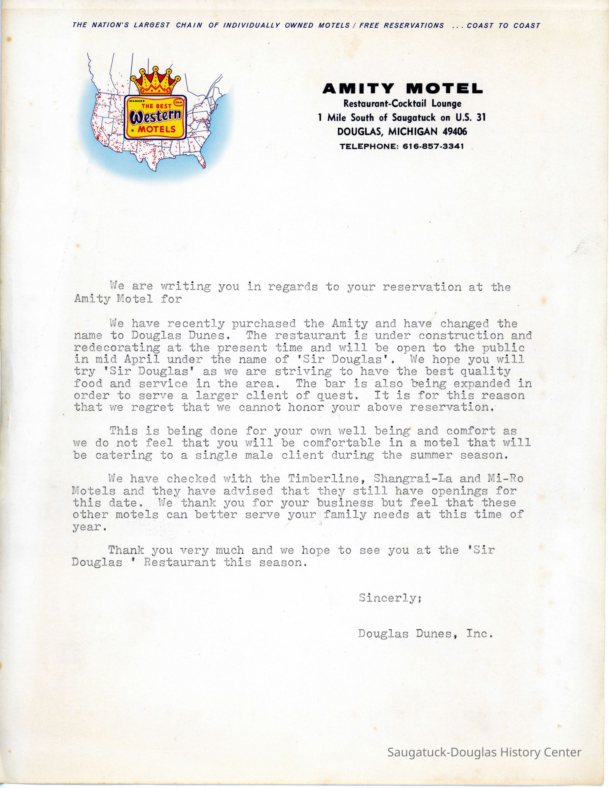 76. Form letter from Douglas Dunes with Amity Motel letterhead