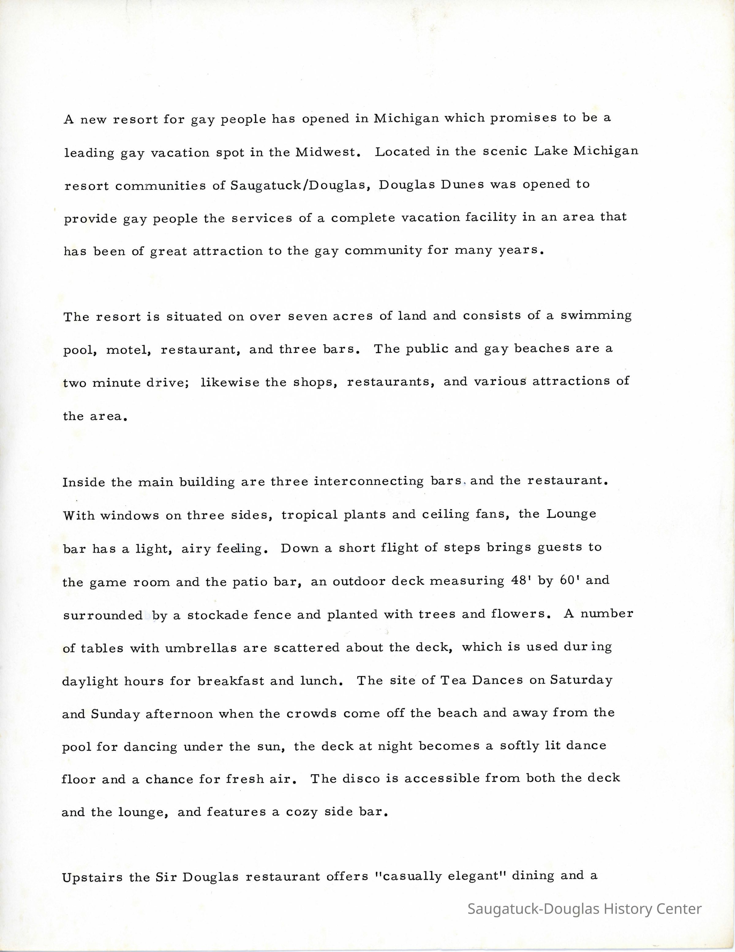 A press release from Douglas Dunes describing the accommodations of Douglas Dunes. It specifically mentions that the hotel is "for gay people."