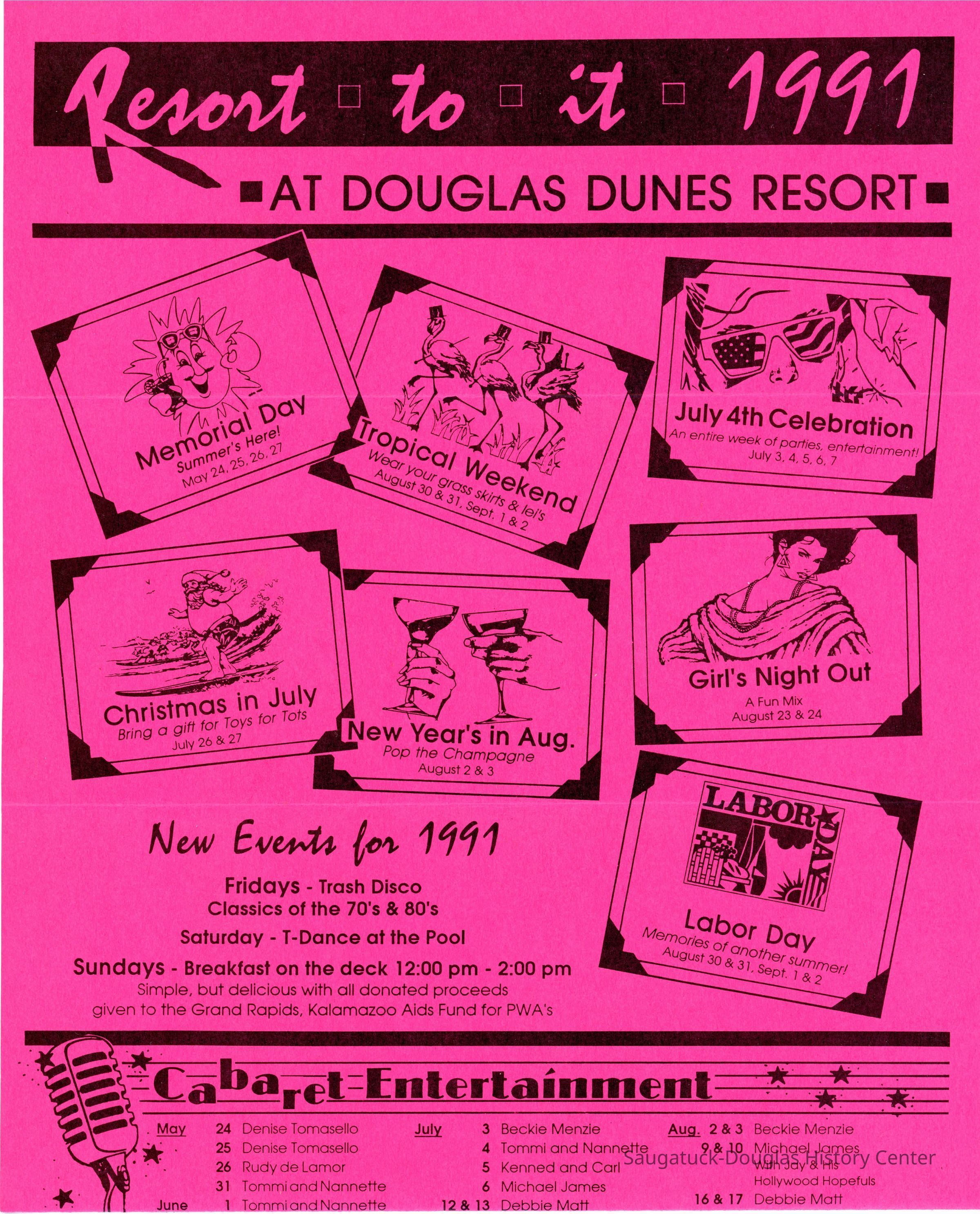 Flier describing various events for 1991 including Tropical Weekend, Christmas in July, and New Year's in August.