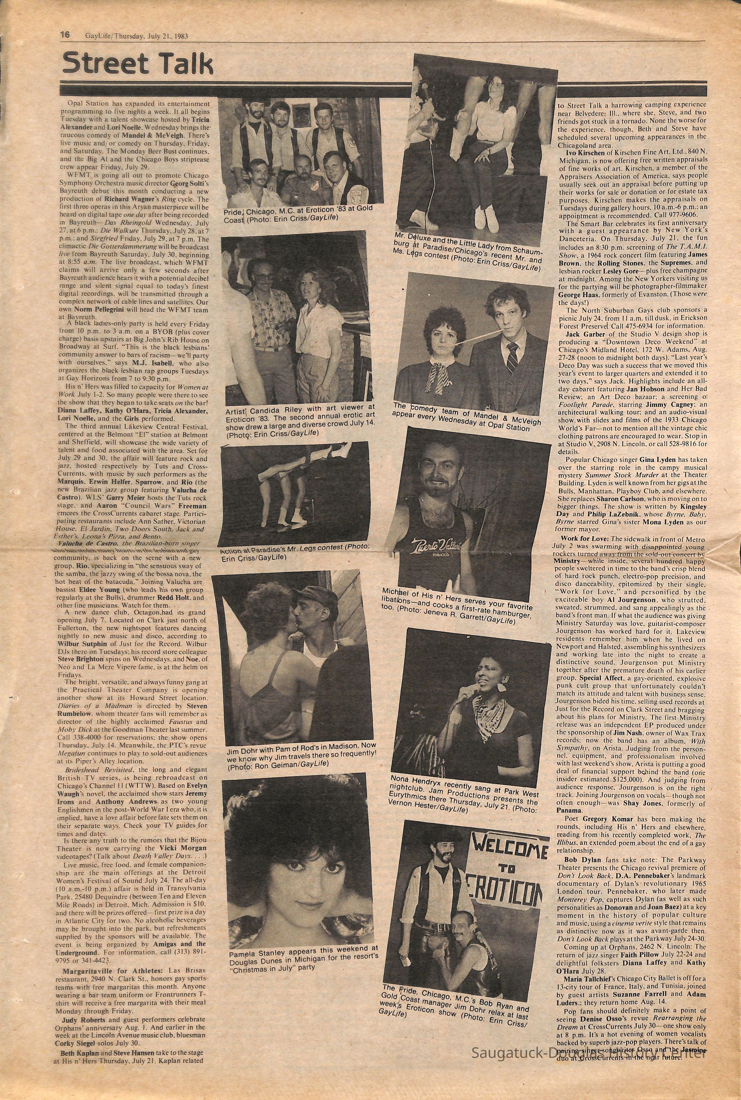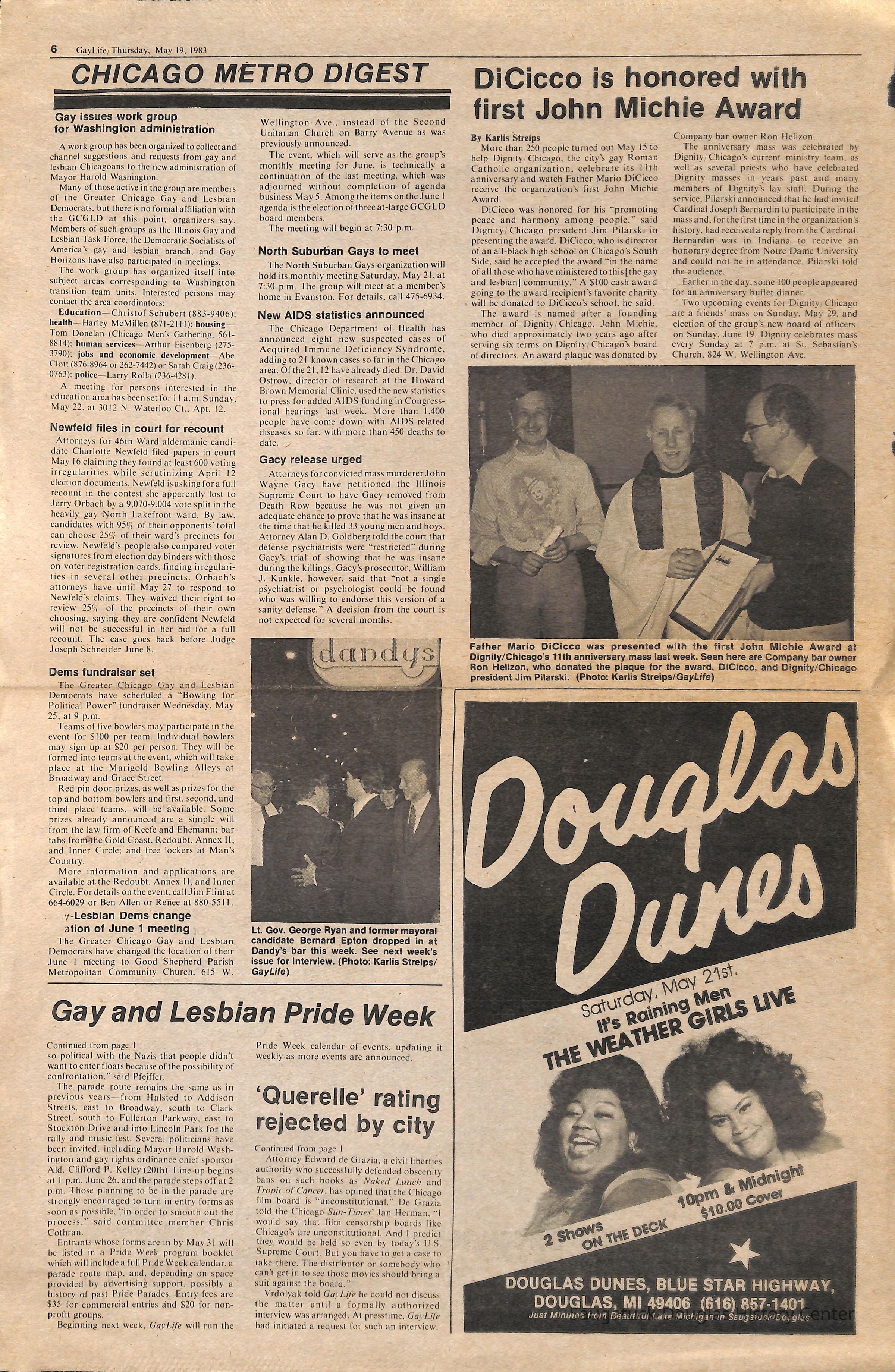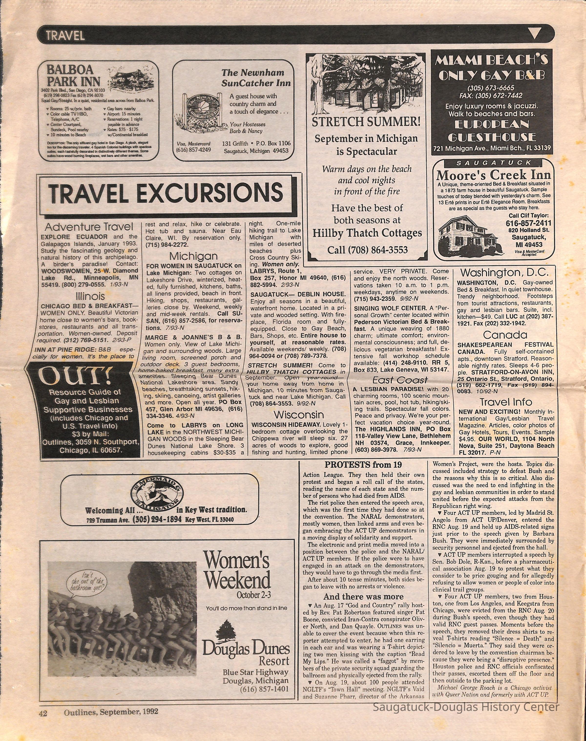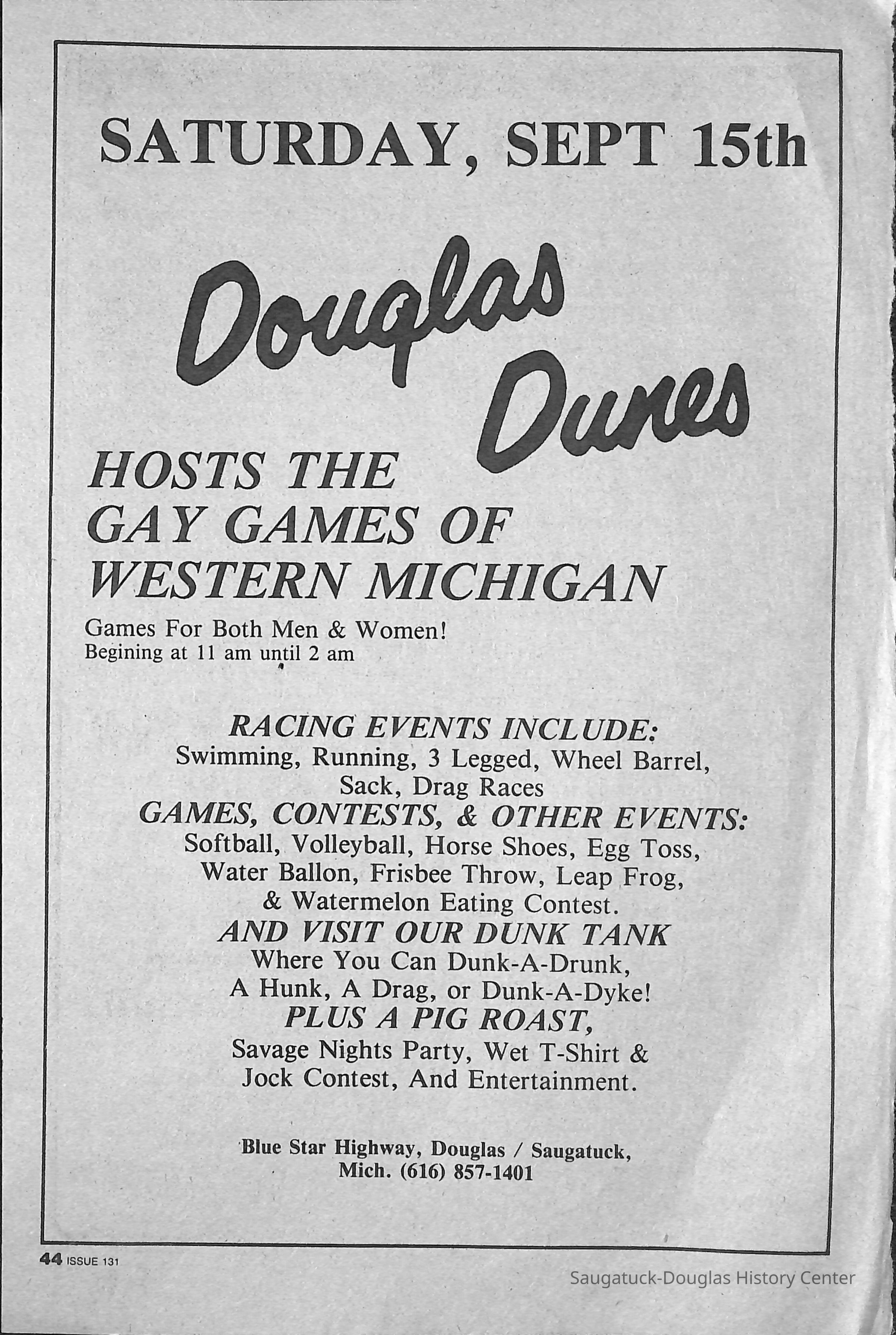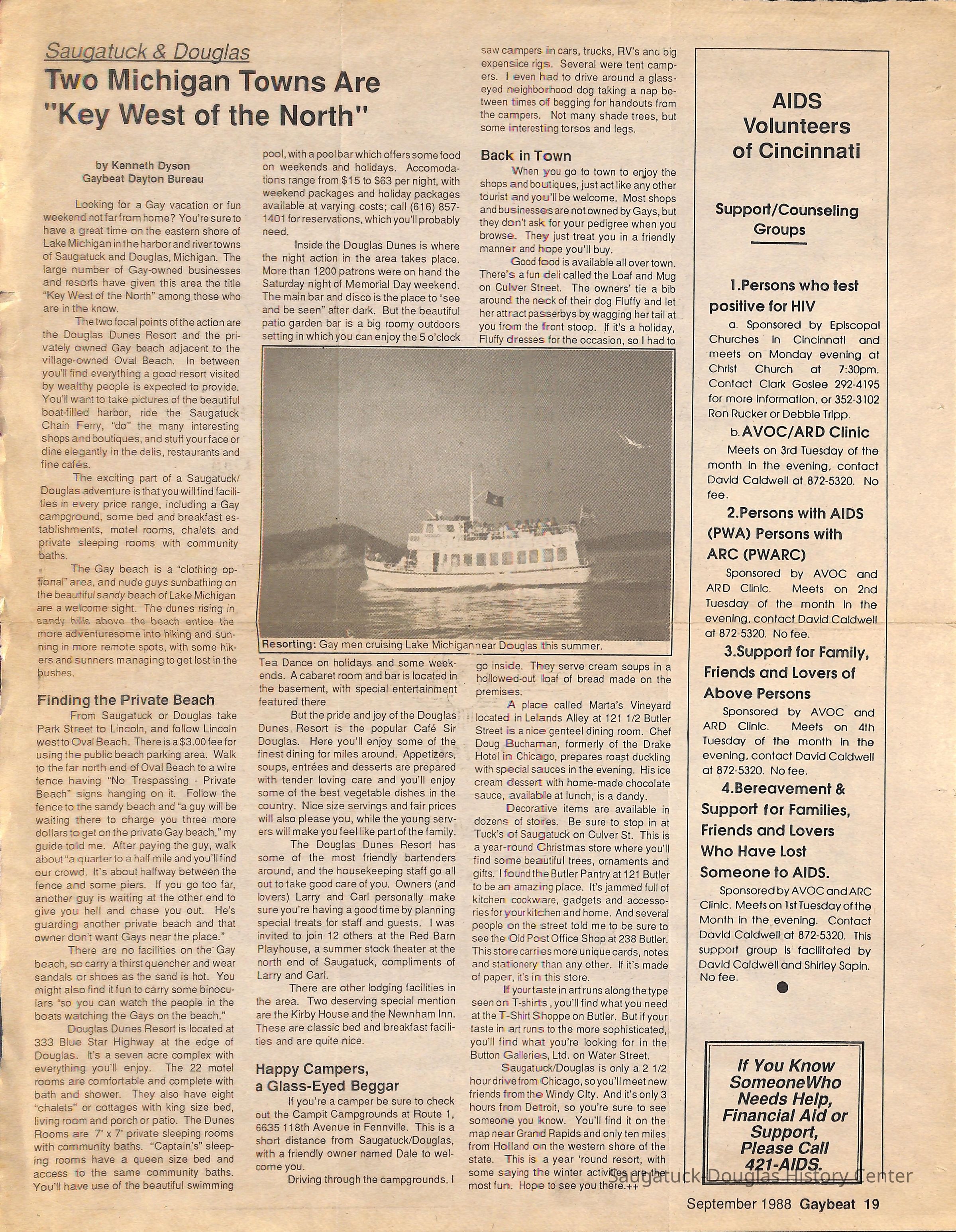 An article in Gaybeat newspaper on Douglas and Saugatuck includes coverage of Douglas Dunes.