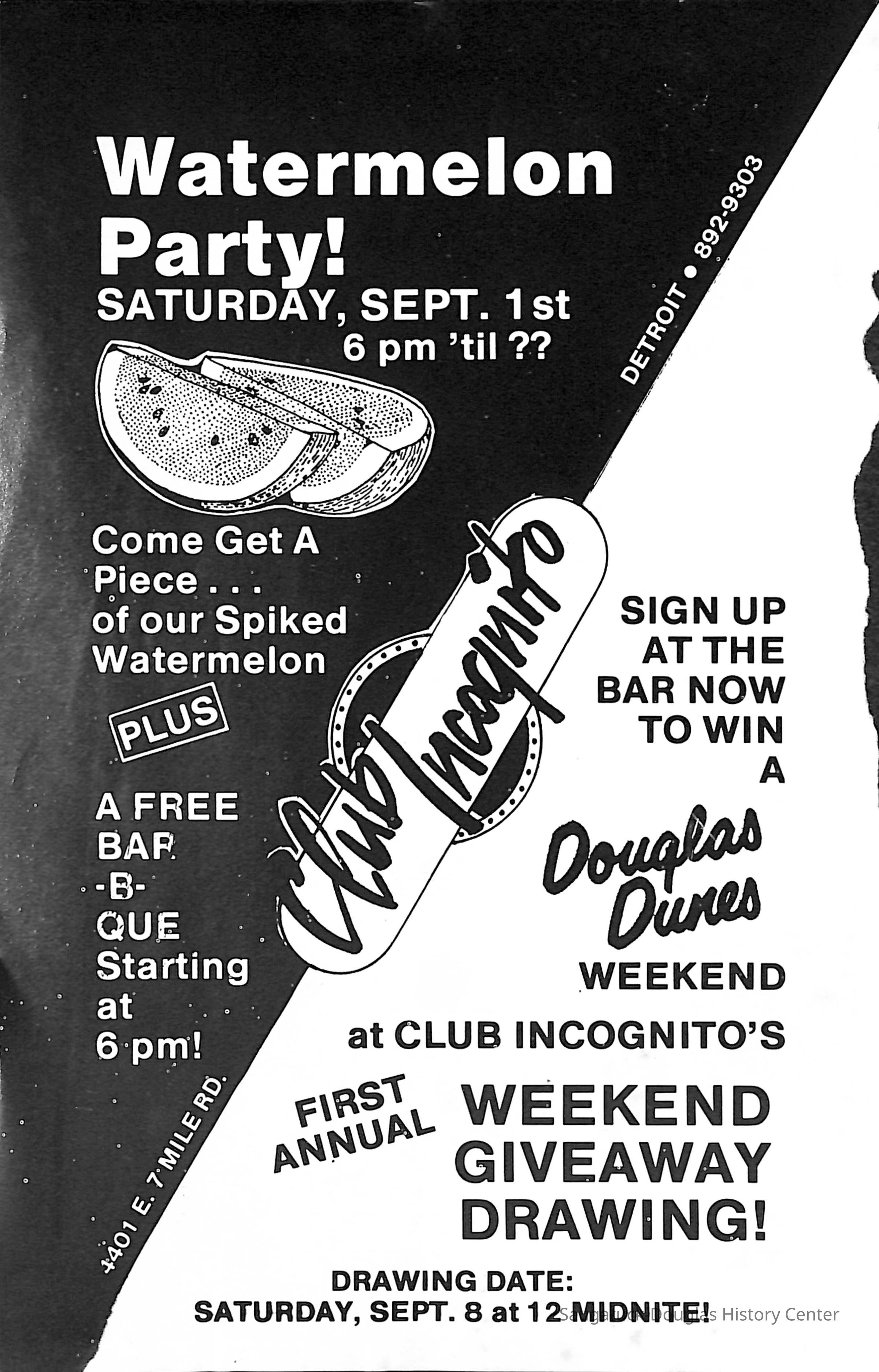 An advertisement in Cruise magazine for the Watermelon party at Club Incognito which included a raffle for a trip to Douglas Dunes.