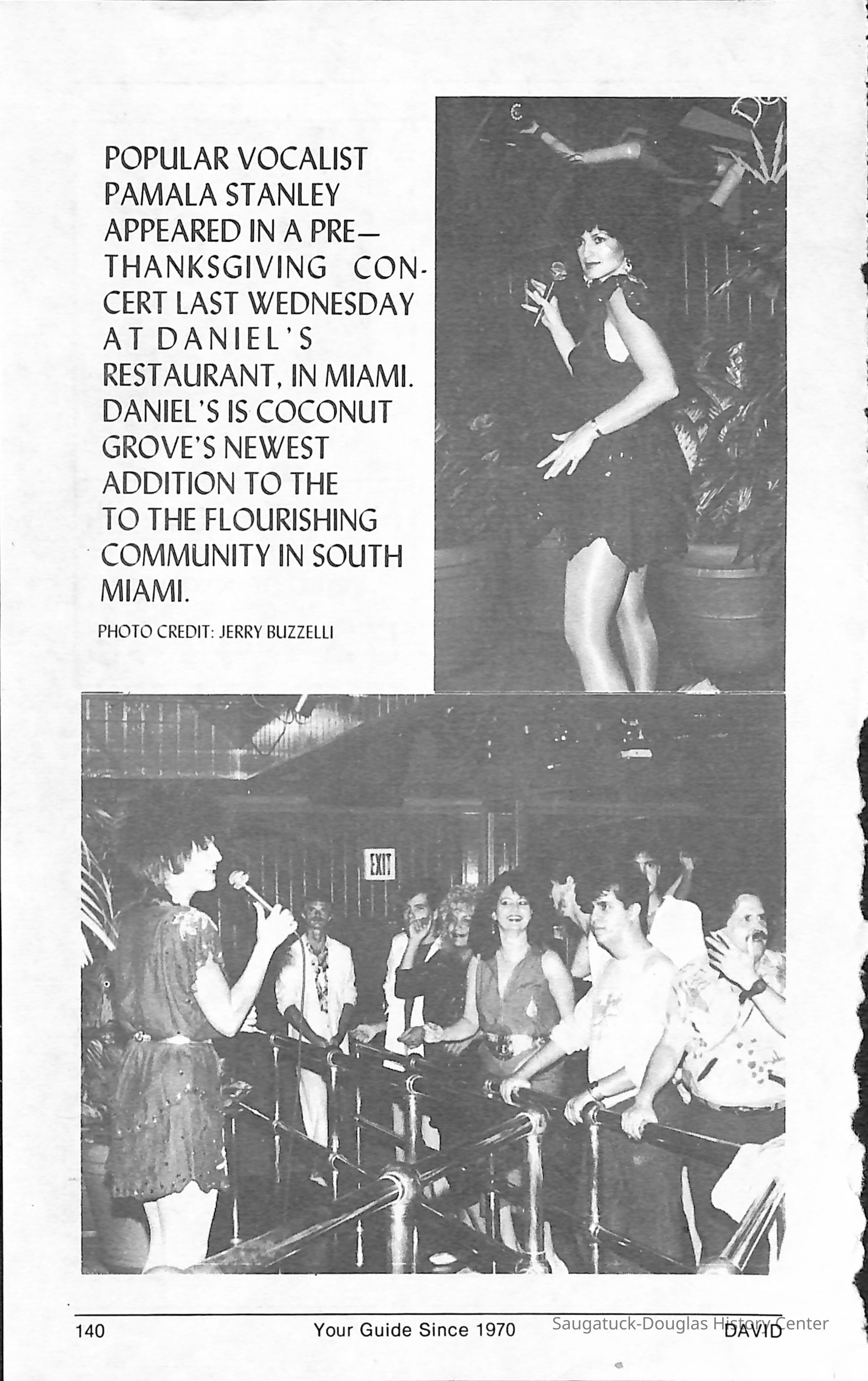A caption and two photos of Pamala Stanley performing at the pre-Thanksgiving concert at Daniel's restaurant in Miami. Stanley periodically sang at Douglas Dunes.