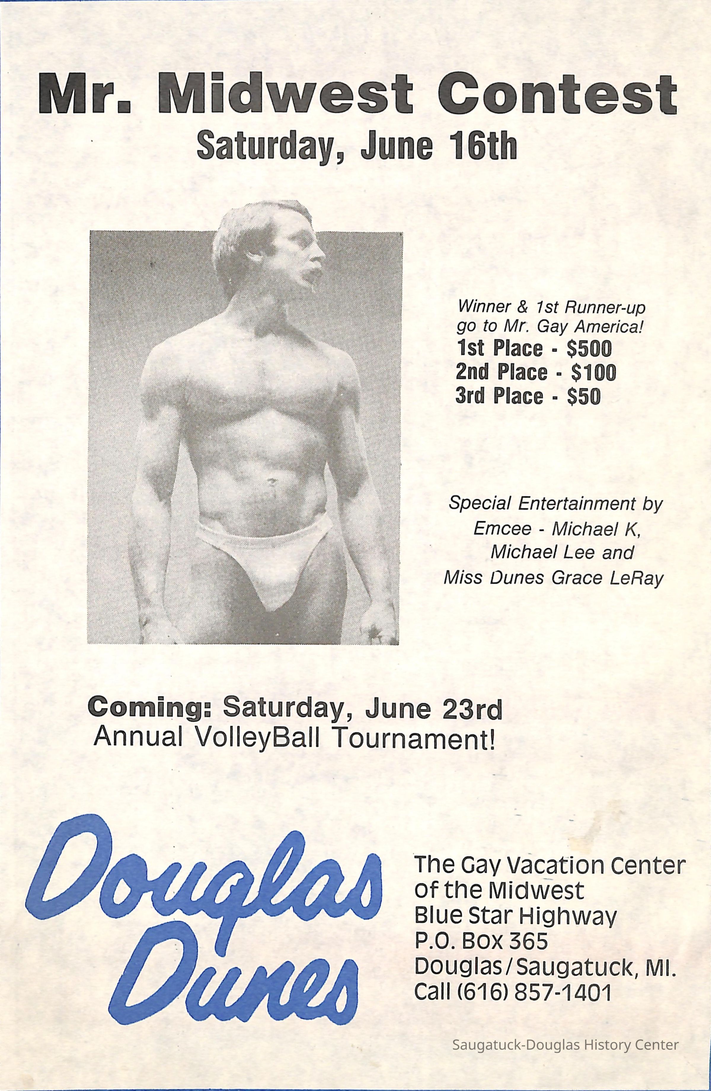 An advertisement for the Mr. Midwest Contest at Douglas Dunes with a notice about the annual volleyball tournament.