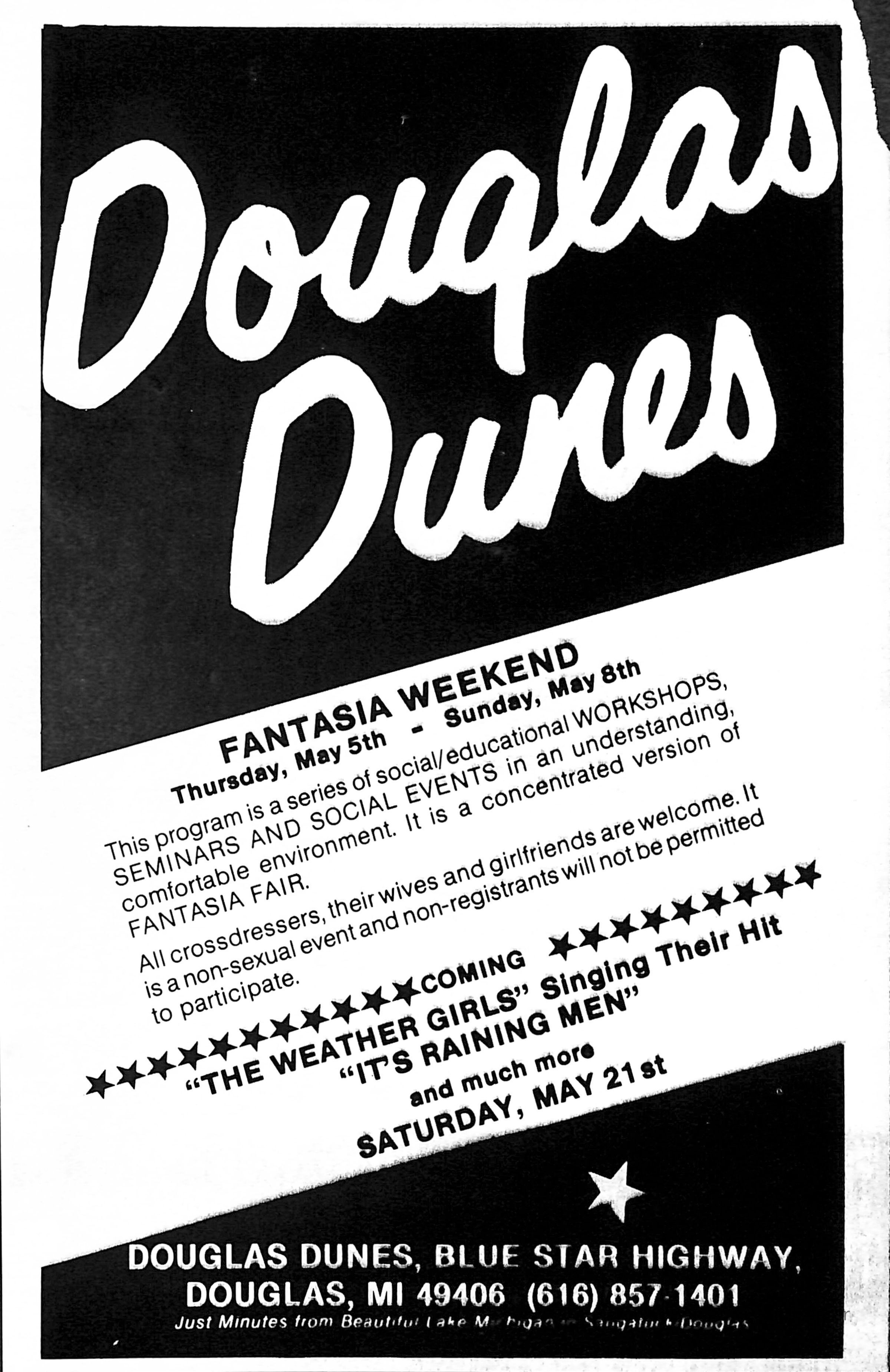 An advertisement for Fantasia Weekend at Douglas Dunes which included workshops, seminars, and social events on crossdressing.