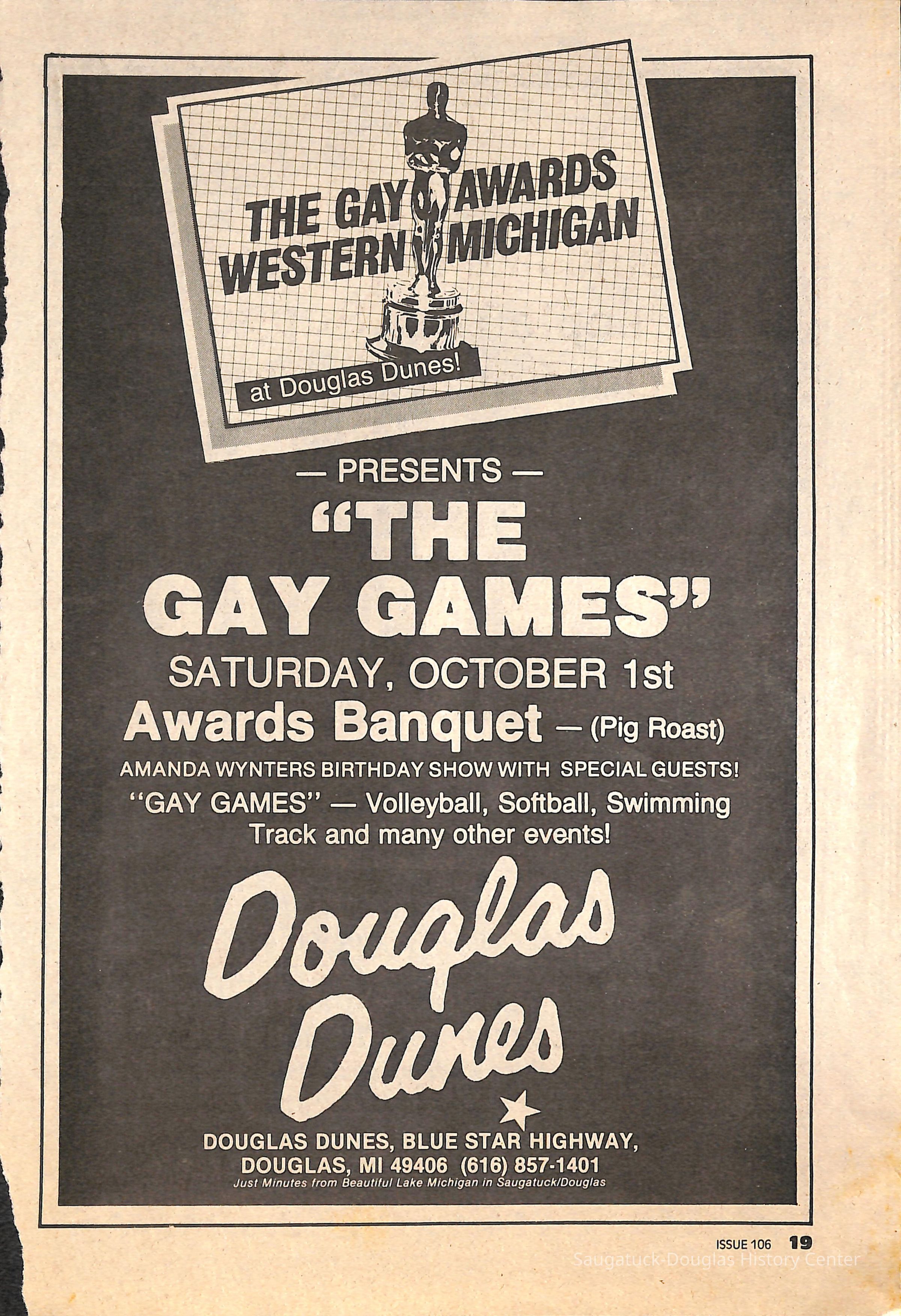 An advertisement in Metra magazine for the Gay Awards Western Michigan's Gay Games at Douglas Dunes.