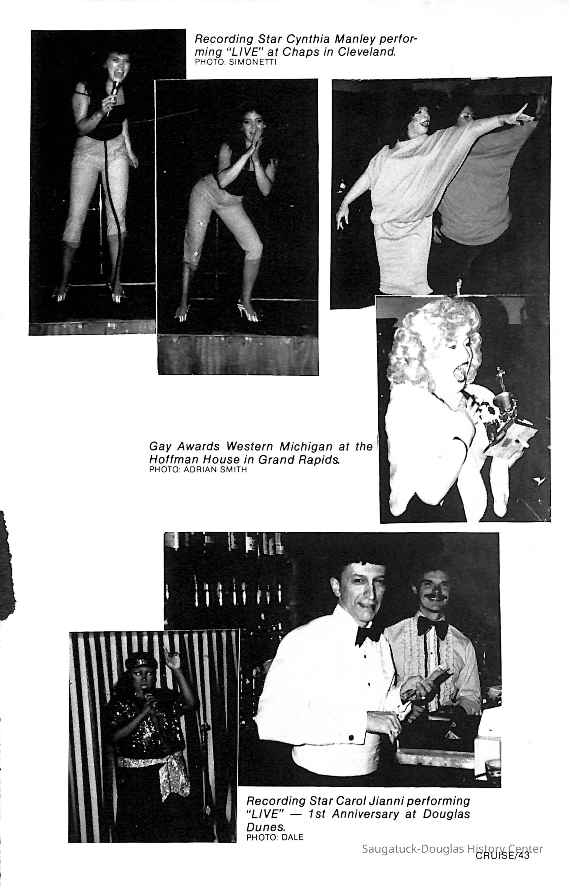 Objects 37, 57, and 71 refer to the Gay Awards West Michigan 1986 A Grand Affair Awards Show. The Gay Awards West Michigan (GAWM) was an organization formed “to recognize individuals in Western Michigan for outstanding achievements in their respective areas of talent, skills and-or performances" (71). The 1986 GAWM award show was held at Douglas Dunes on Sunday, May 18, 1986. Tickets were $5.00 and were available for purchase at Douglas Dunes and the Carousel. The event was titled “A Grand Affair” and had performances from Tiffany Ariagus, Odessa Brown, and Diana Black. Audience members arrived at 4:00 for the cocktail party where voting took place. Then at 6:00, after the votes were counted, the awards were presented (37). Photos of the event are archived with the Douglas Dunes photo collection.