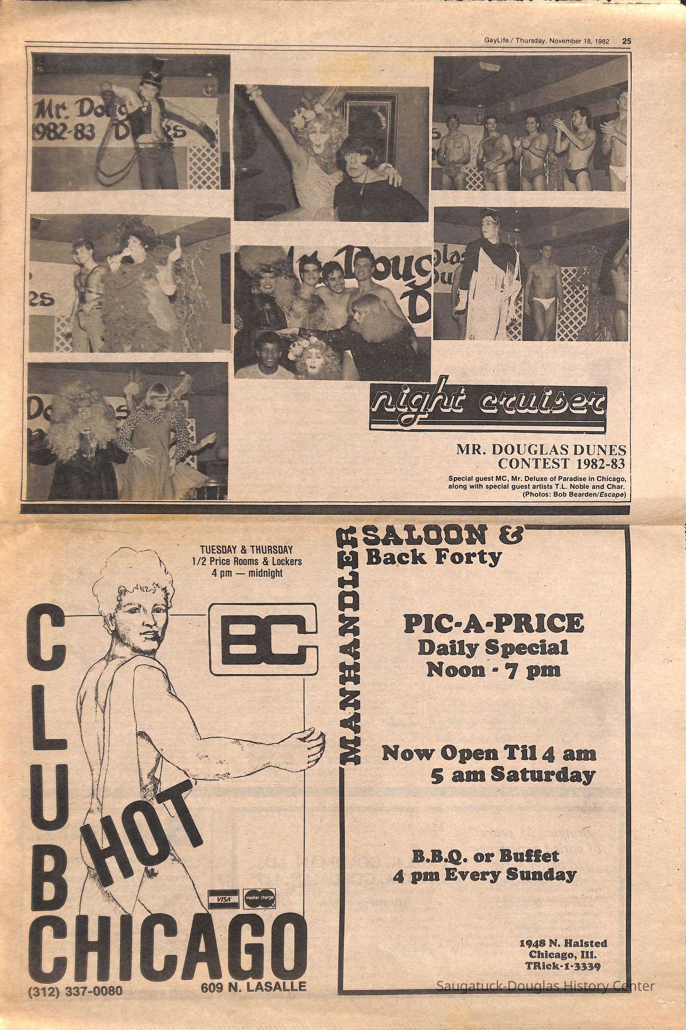Photos from the Mr. Douglas Dunes Contest 1982-3 in the Night Cruiser section of Gay Life.