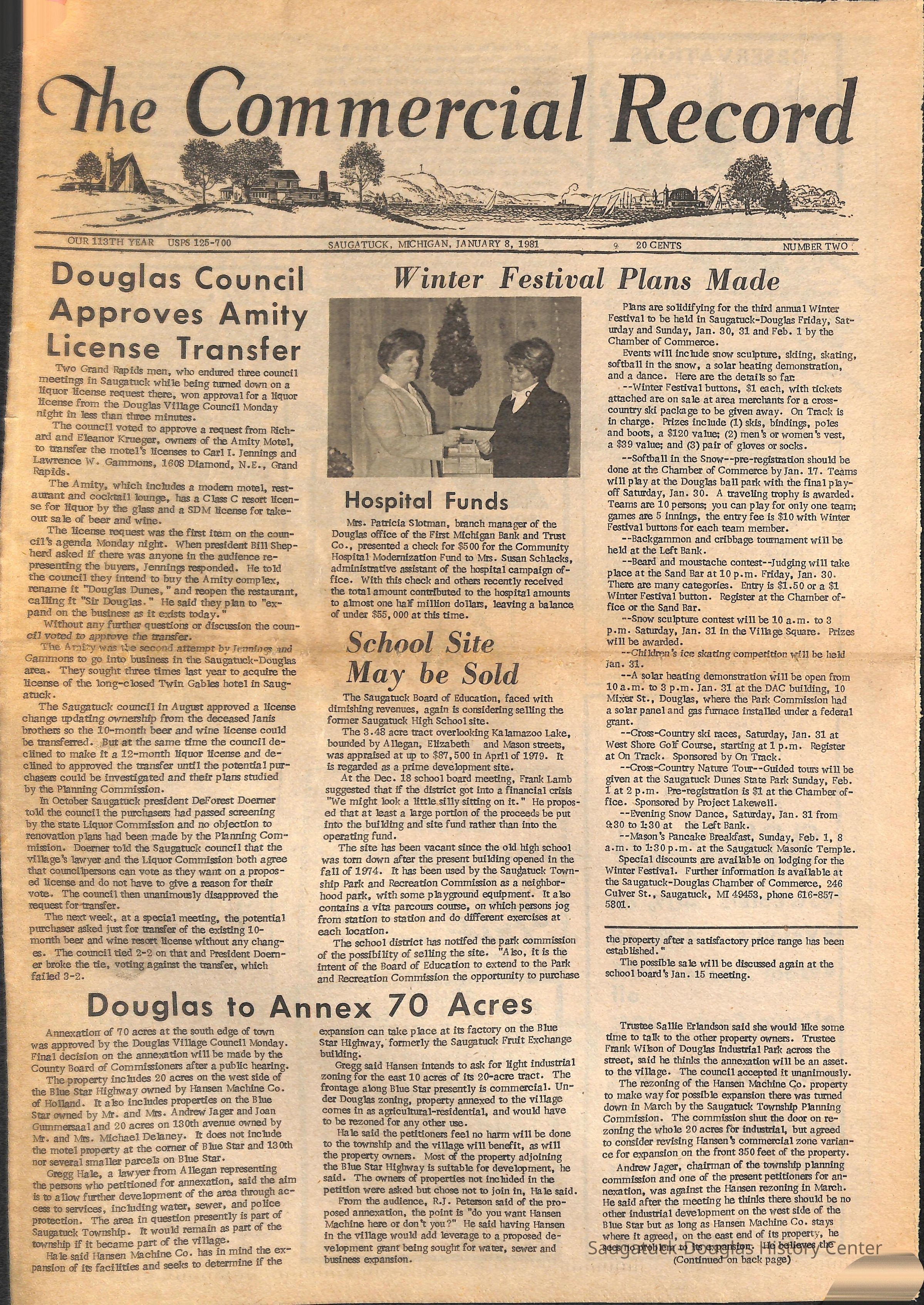 A front page article in the Commercial Record on the approval of the license transfer from Amity Motel to Douglas Dunes Resort.
