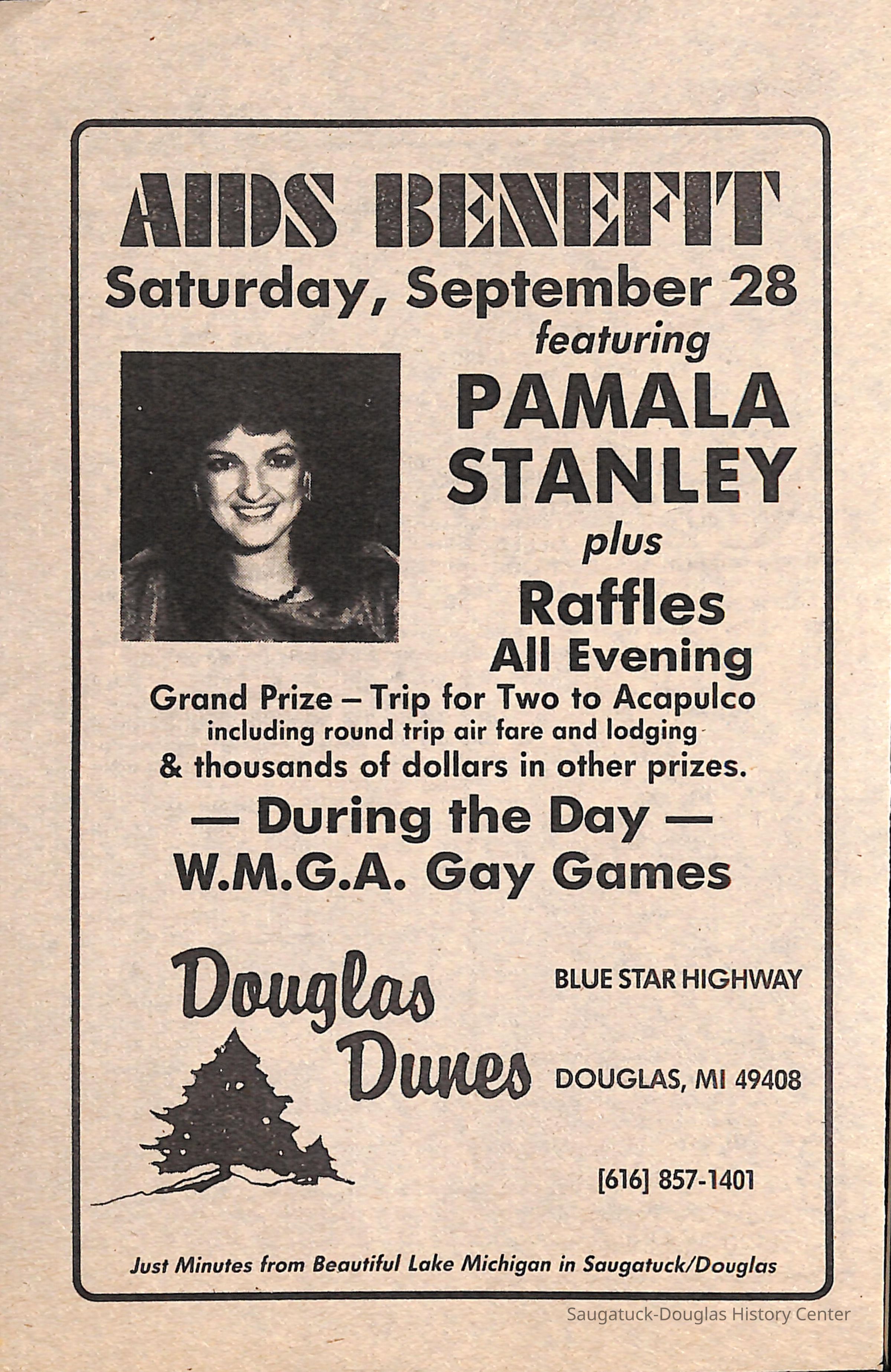 An advertisement in Gay Chicago magazine for the AIDS benefit at Douglas Dunes with special guest Pamala Stanley and for the West Michigan Gay Awards Gay Games event during the day.