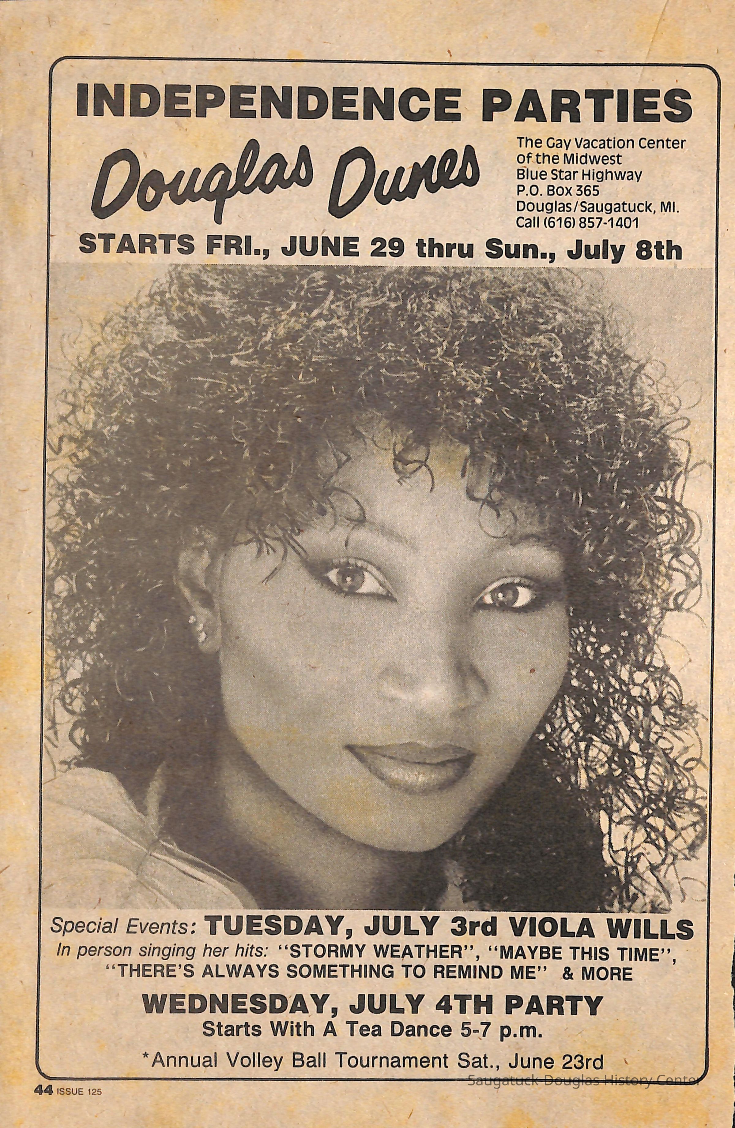An advertisement for Viola Wills for the 4th of July parties at Douglas Dunes in Metra magazine.