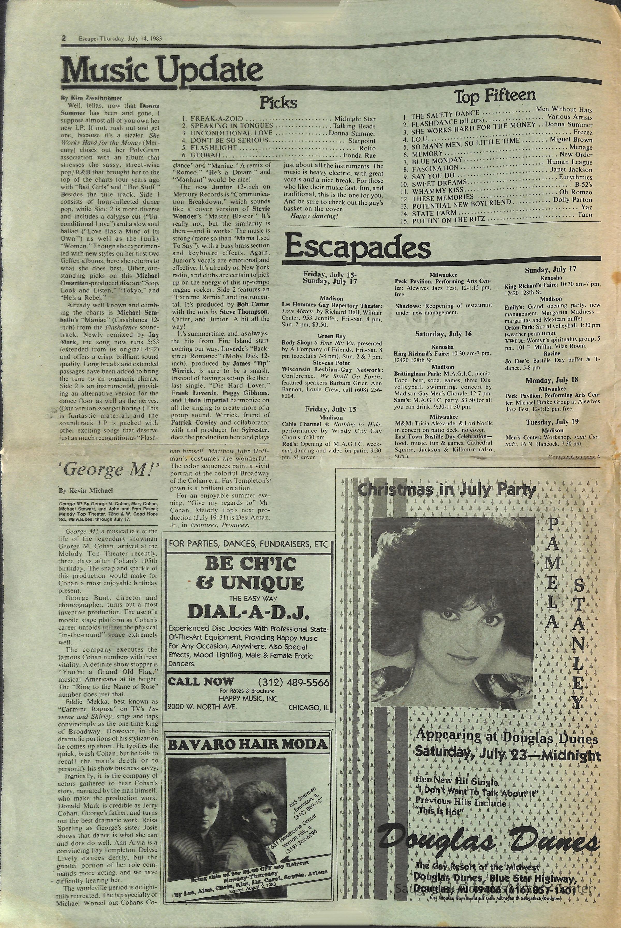 An advertisement for Douglas Dunes in Metra magazine for the summer of 1985. It states "Hot Men, Beach parties, Cruising, Tea dances, Shows, Fine Dining, Volleyball, and now... Monday Boat Cruise's [sic]."