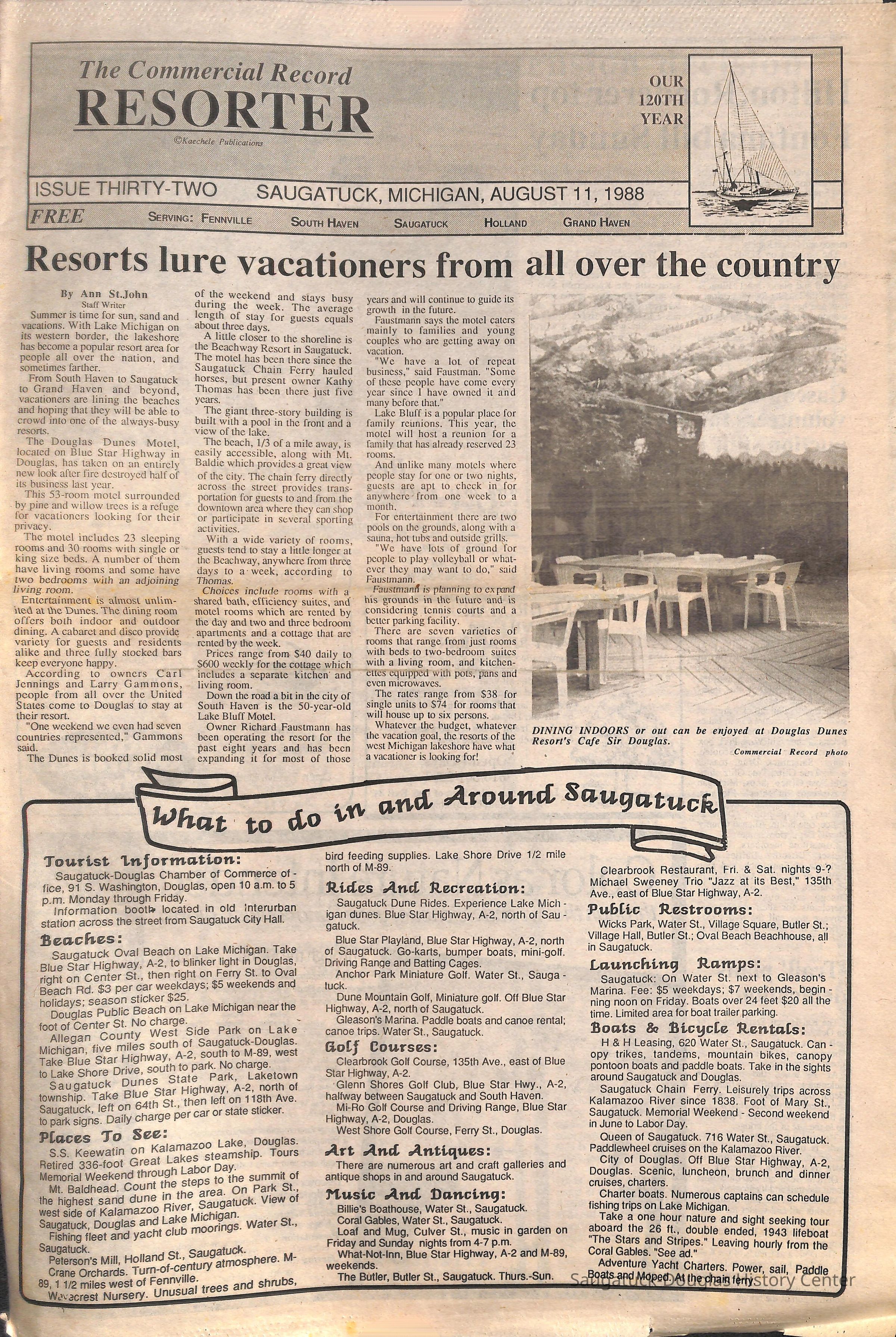 A front page article in the Commercial Record Resorter on Douglas Dunes Resort with extensive coverage on the accommodations.