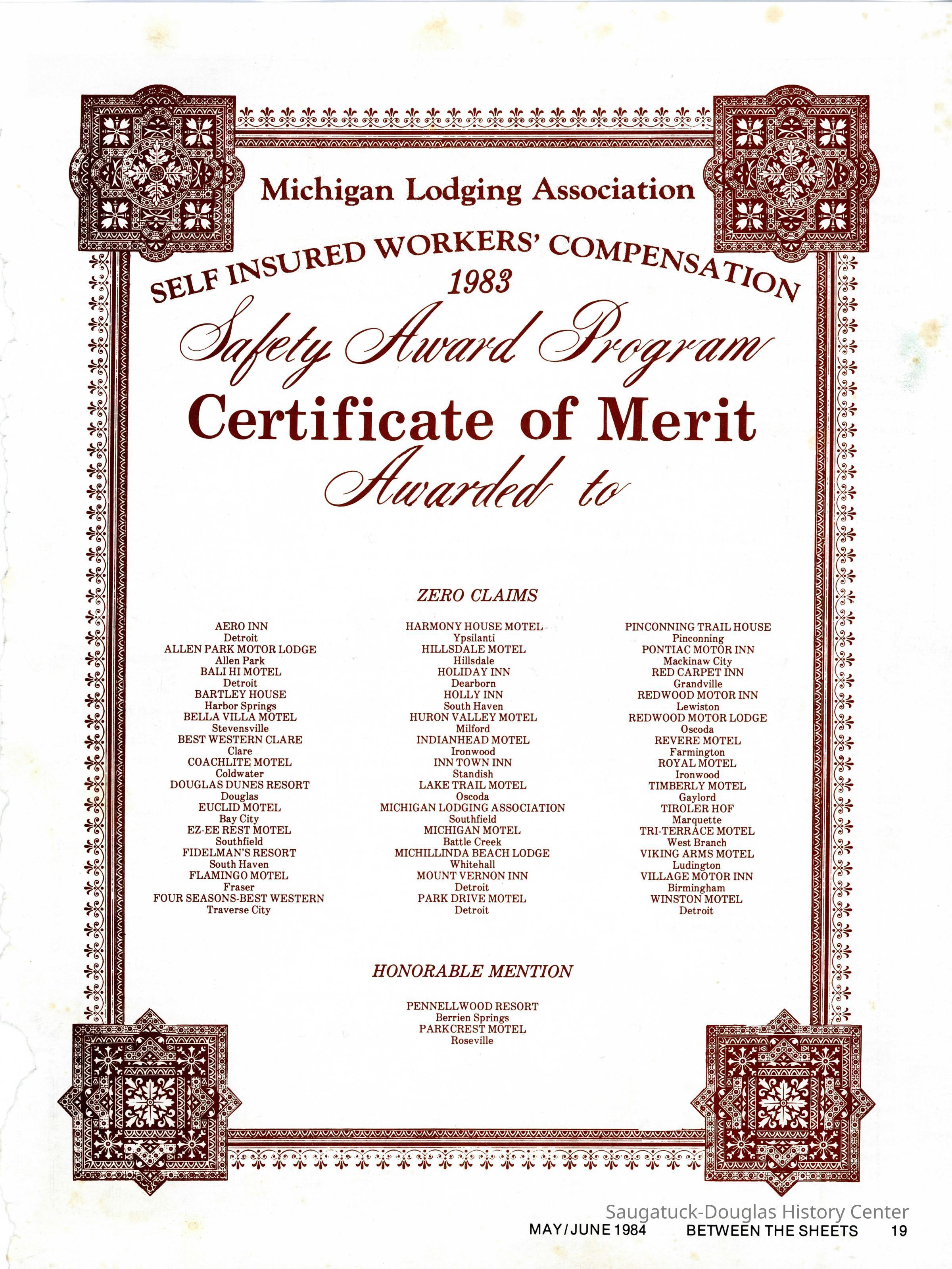 An award from the Michigan Lodging Association for zero workers' compensation claims for Douglas Dunes published in Between the Sheets.