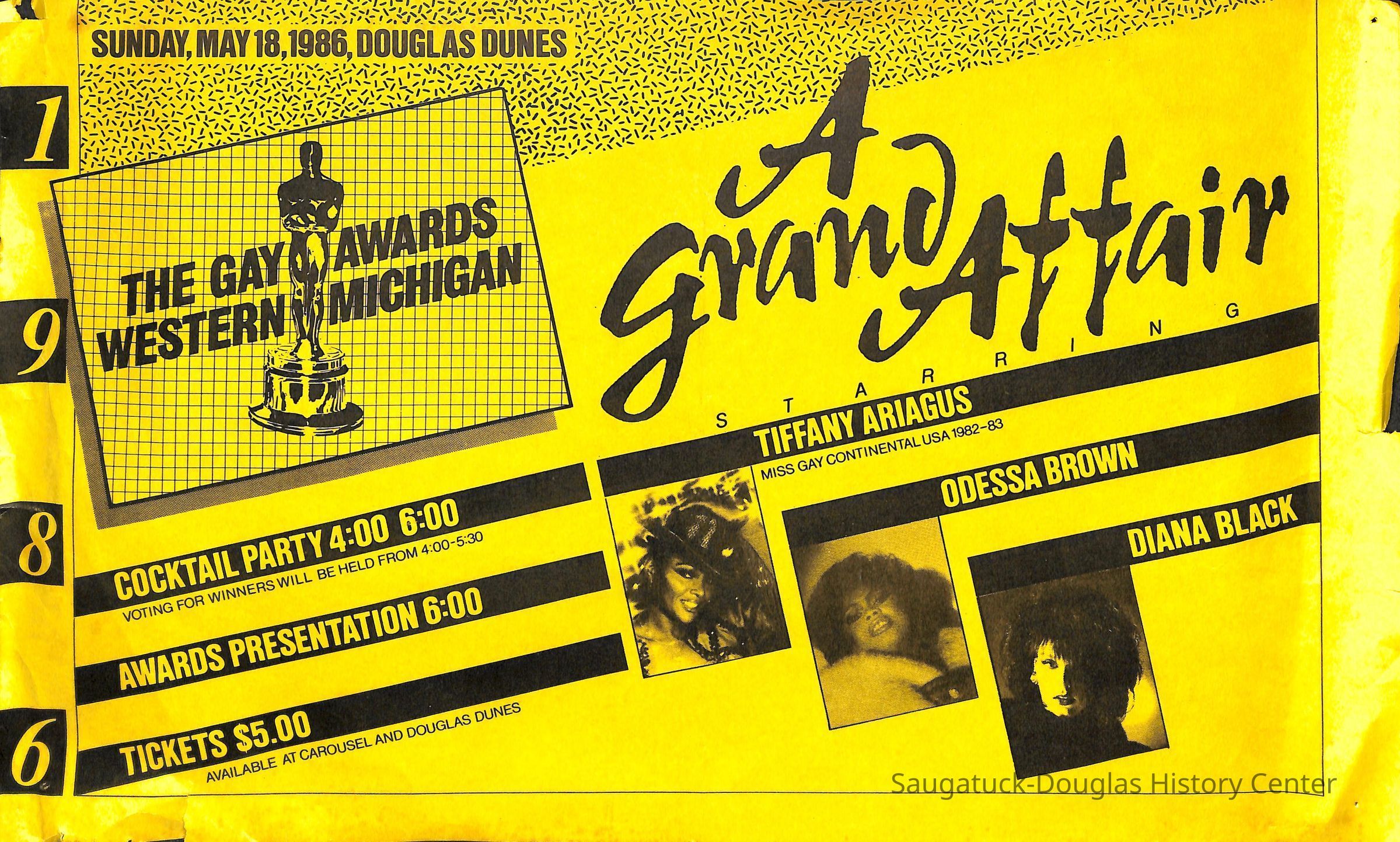 A poster for the 1986 Gay Awards Western Michigan: A Grand Affair presentation at Douglas Dunes on May 18.