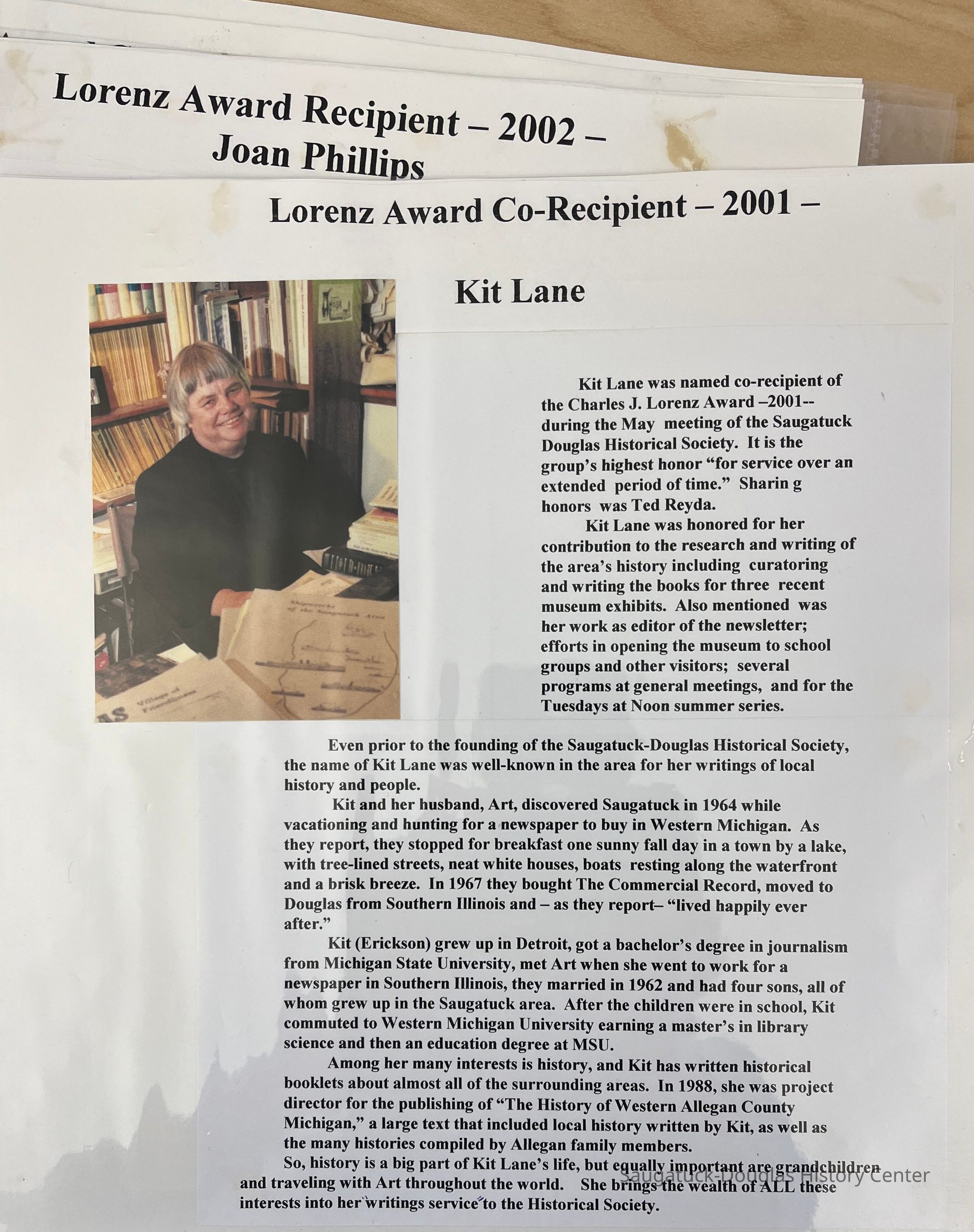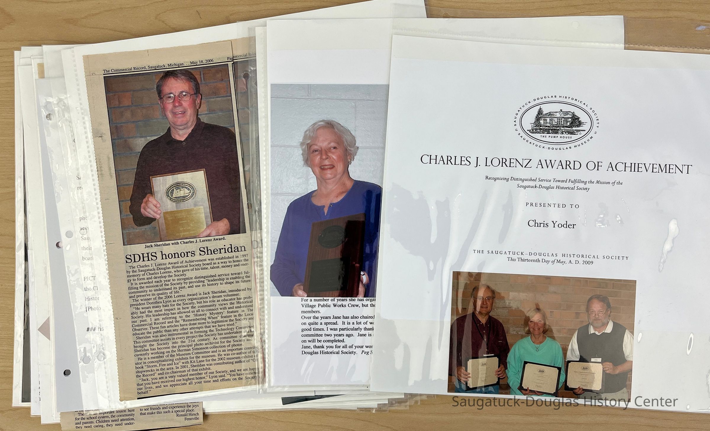 The Charles J. Lorenz Award of Achievement is given to acknowledge distinguished leadership in service to the Society toward fulfilling the spirit and mission of the Society, namely, "to provide leadership, enabling the community to understand its past, and use its history to shape its future and preserve its quality of life". Award nomination form 2011 The Lorenz Award was established in 1997 to honor the memory of Charles “Chuck” Lorenz, who gave generously of his time, talent, money and energy in researching the early history of Saugatuck and Singapore, as well as the formation and development of this organization. Winners are selected each year by a special History Center committee, recognizing distinguished leadership in fulfilling the Center's mission to "help the community understand its past and use its history to shape its future and preserve its quality of life". SDHC press release 18 Sept. 2020