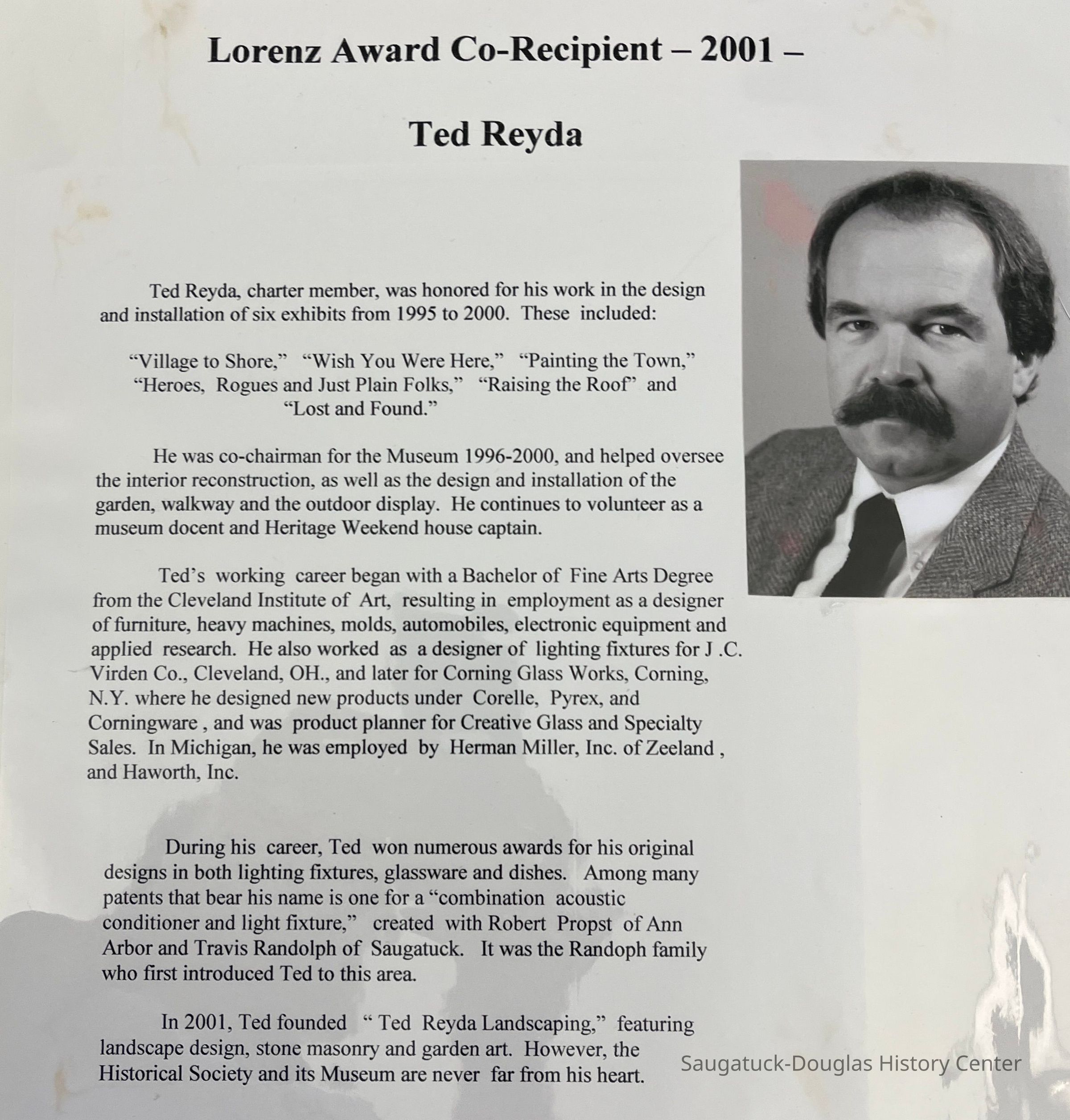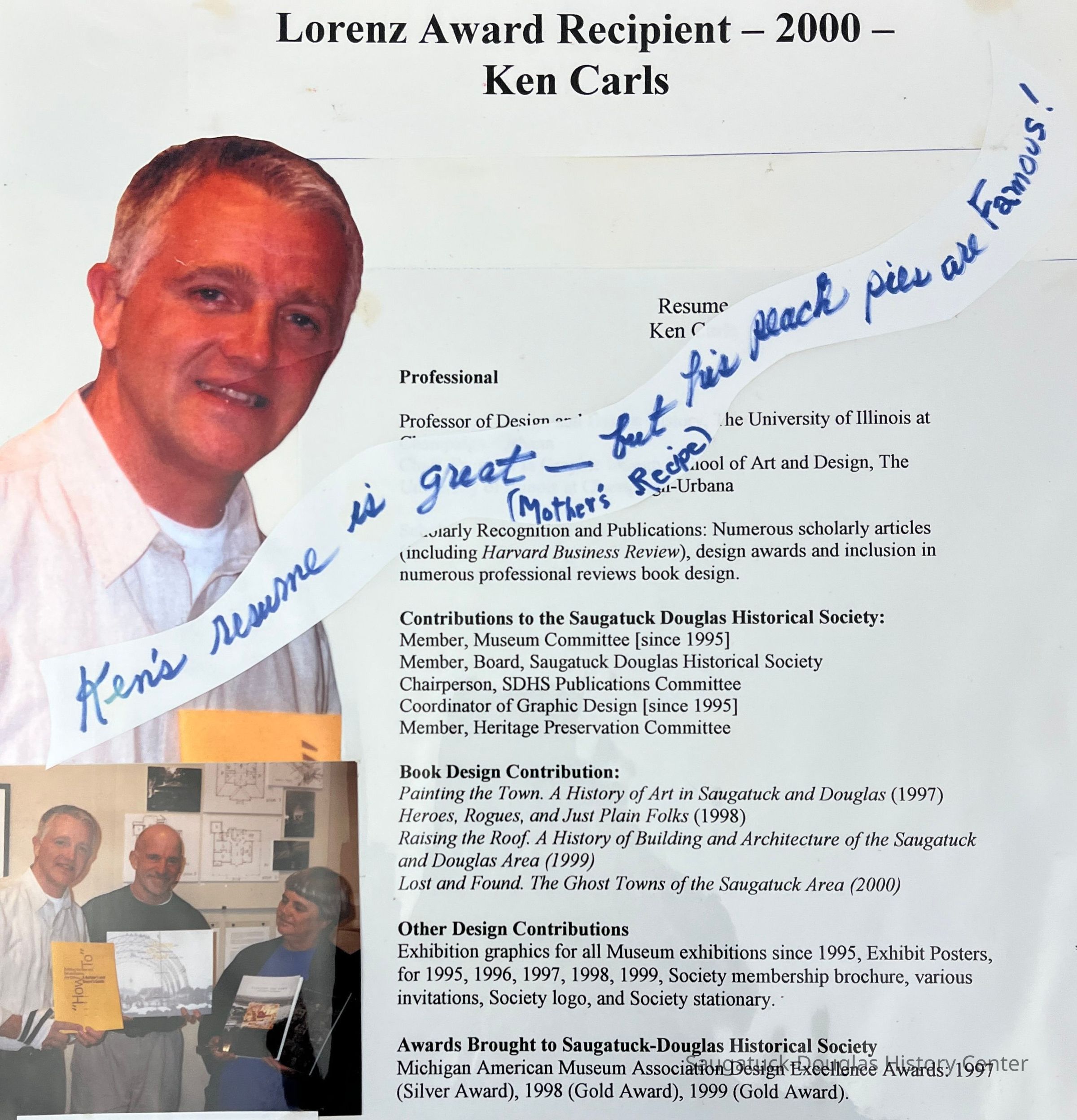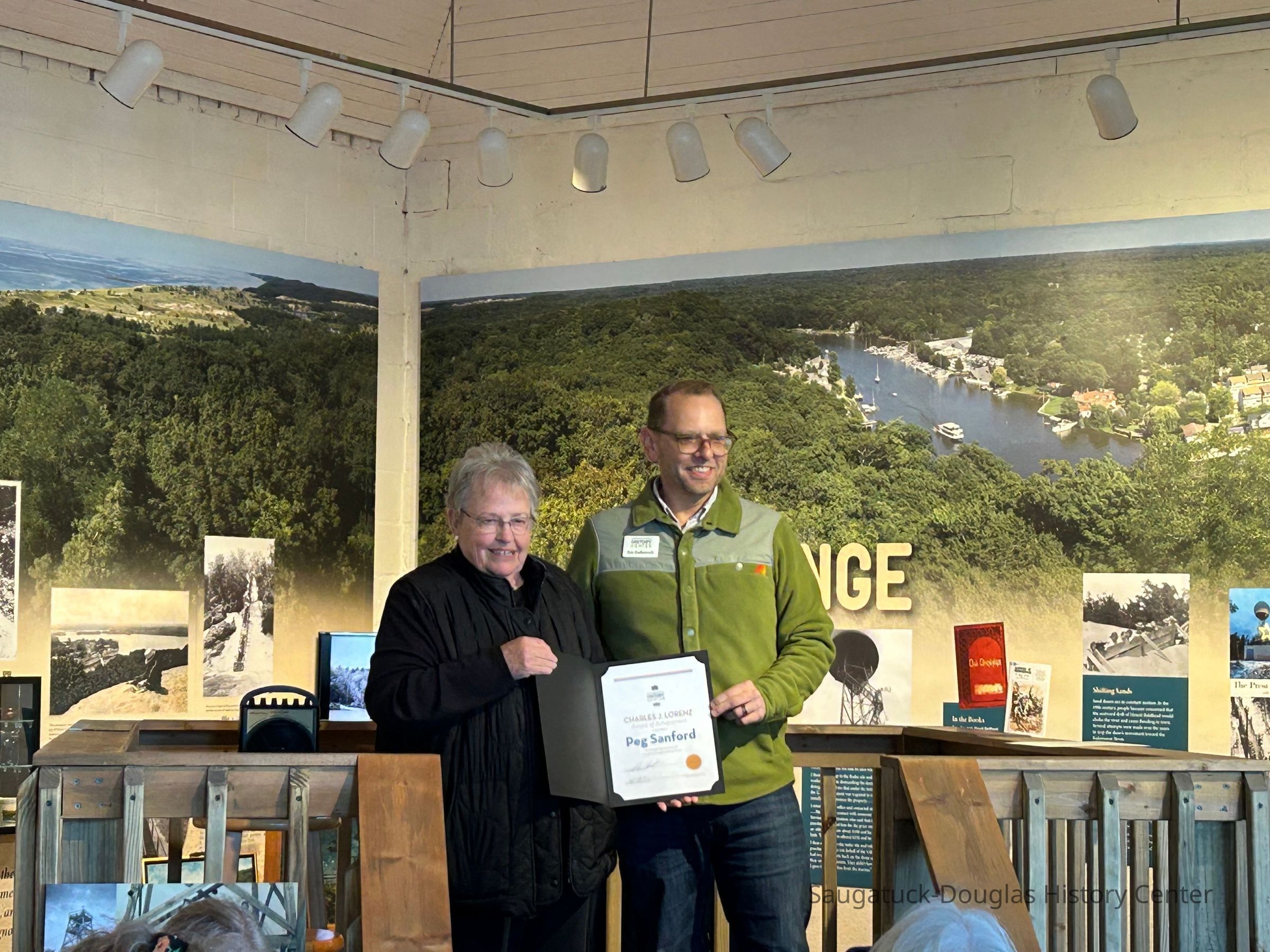 The Charles J. Lorenz Award of Achievement is given to acknowledge distinguished leadership in service to the Society toward fulfilling the spirit and mission of the Society, namely, "to provide leadership, enabling the community to understand its past, and use its history to shape its future and preserve its quality of life". Award nomination form 2011 The Lorenz Award was established in 1997 to honor the memory of Charles “Chuck” Lorenz, who gave generously of his time, talent, money and energy in researching the early history of Saugatuck and Singapore, as well as the formation and development of this organization. Winners are selected each year by a special History Center committee, recognizing distinguished leadership in fulfilling the Center's mission to "help the community understand its past and use its history to shape its future and preserve its quality of life". SDHC press release 18 Sept. 2020