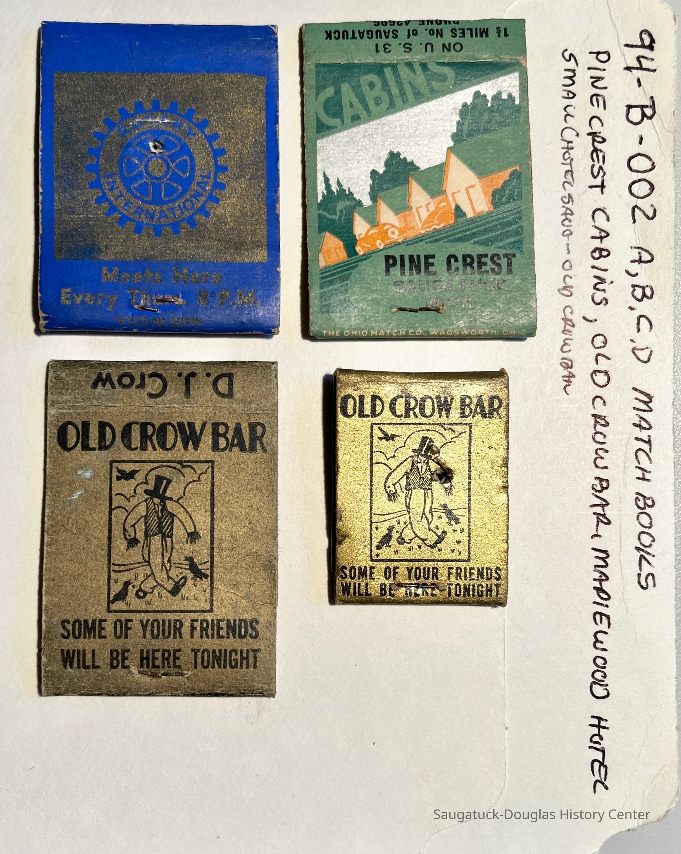 Four books of paper matches advertising the Hotel Maplewood, Pine Crest Cabins and Hotel Saugatuck/Old Crow Bar (two sizes). The Hotel Maplewood matchbook mentions owner-manager W.B. Carr, "Selected Clientele" and that the Rotary Club meets there every Thursday at 8 p.m. The Old Crow Bar side of the Hotel Saugatuck matchbook reminds smokers that "some of your friends will be here tonight" beneath an illustration of a top hat-wearing scarecrow and lists the owner D.J. Crow.