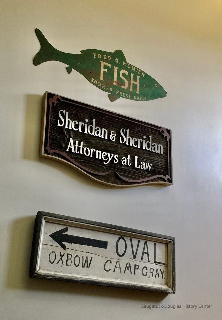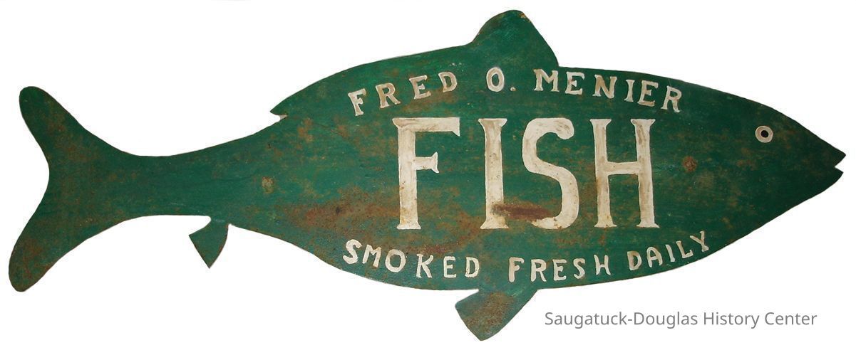 Menier’s Fish Shop original site: Cook Dock, Butler Street at Culver Street collection: Saugatuck-Douglas Historical Society Collection Captain Fred Menier was a Saugatuck fisherman who operated a Mackinac-type sailing boat with steam engine power. He opened a fish shop along the Saugatuck docks in 1894—selling “fresh fish every day.” The Menier family lived at 711 Butler Street. Menier was killed in a boating accident. Source: Signs of the Times: Old Signs from the Saugatuck & Douglas Area, A Collaborative Exhibition Presented by the Saugatuck Center for the Arts and the Saugatuck-Douglas Historical Society, 2009