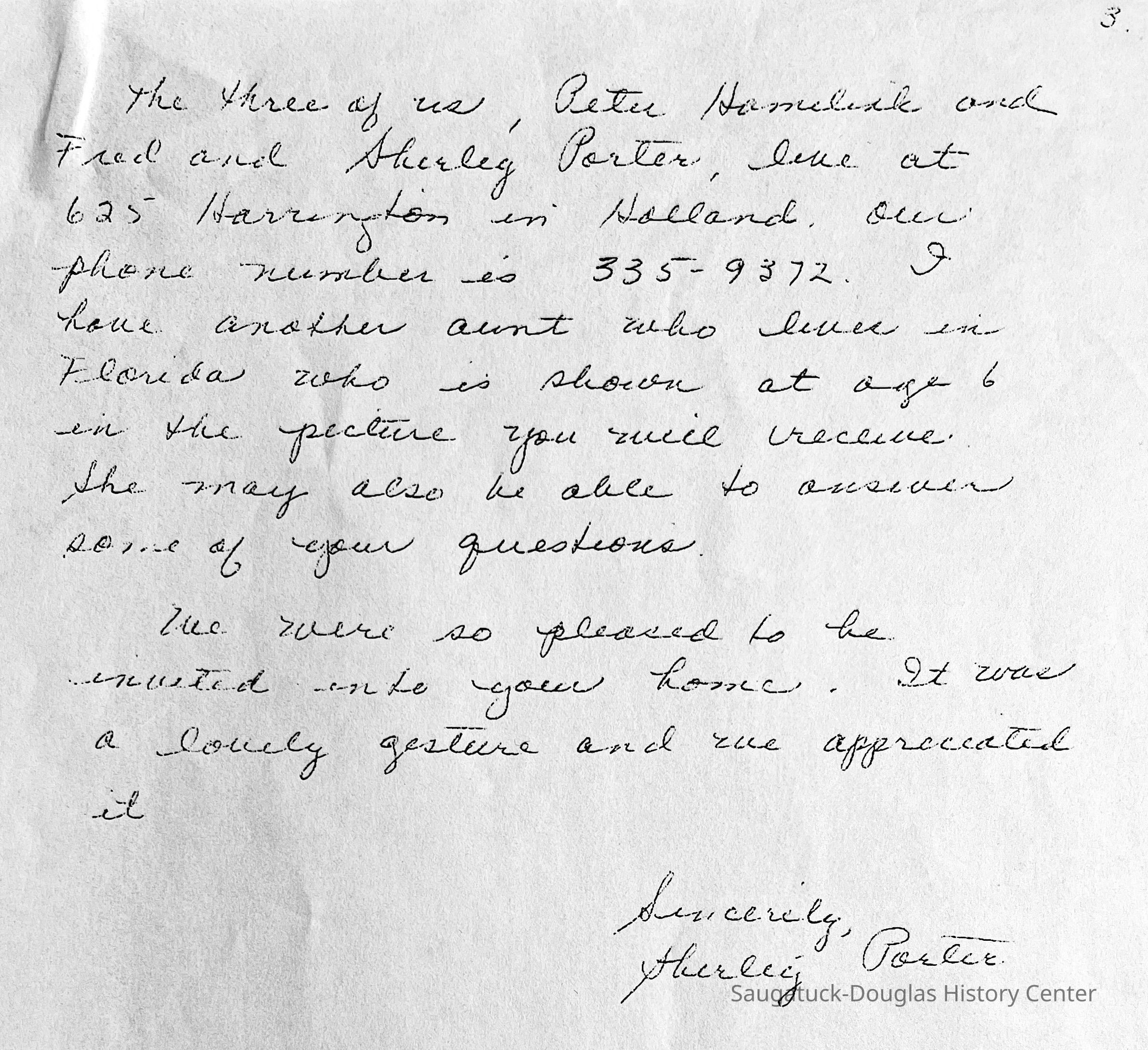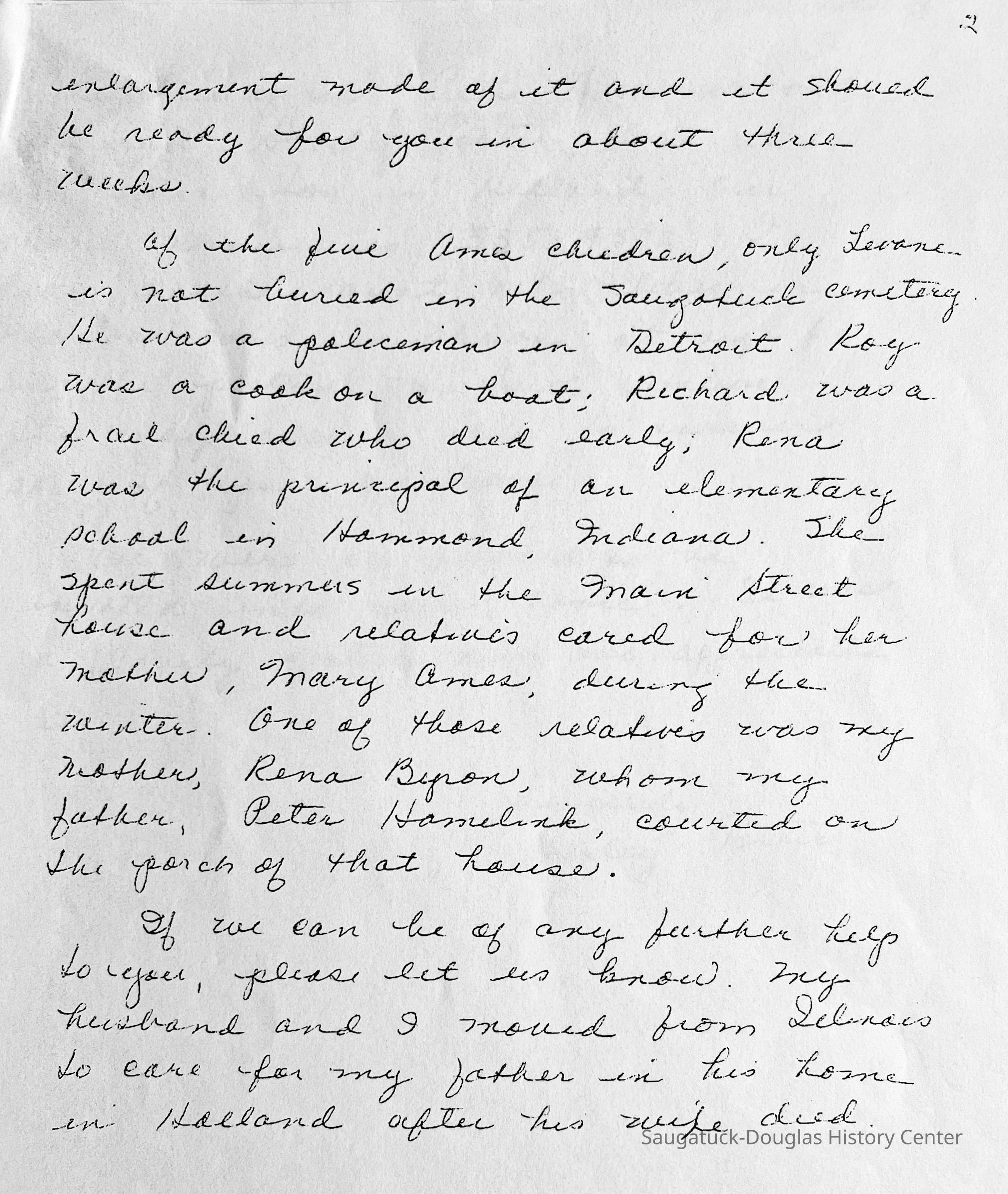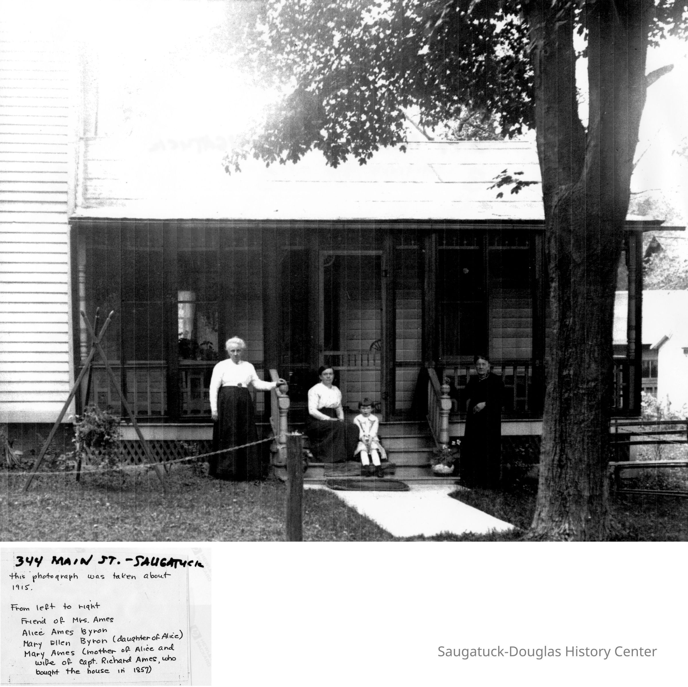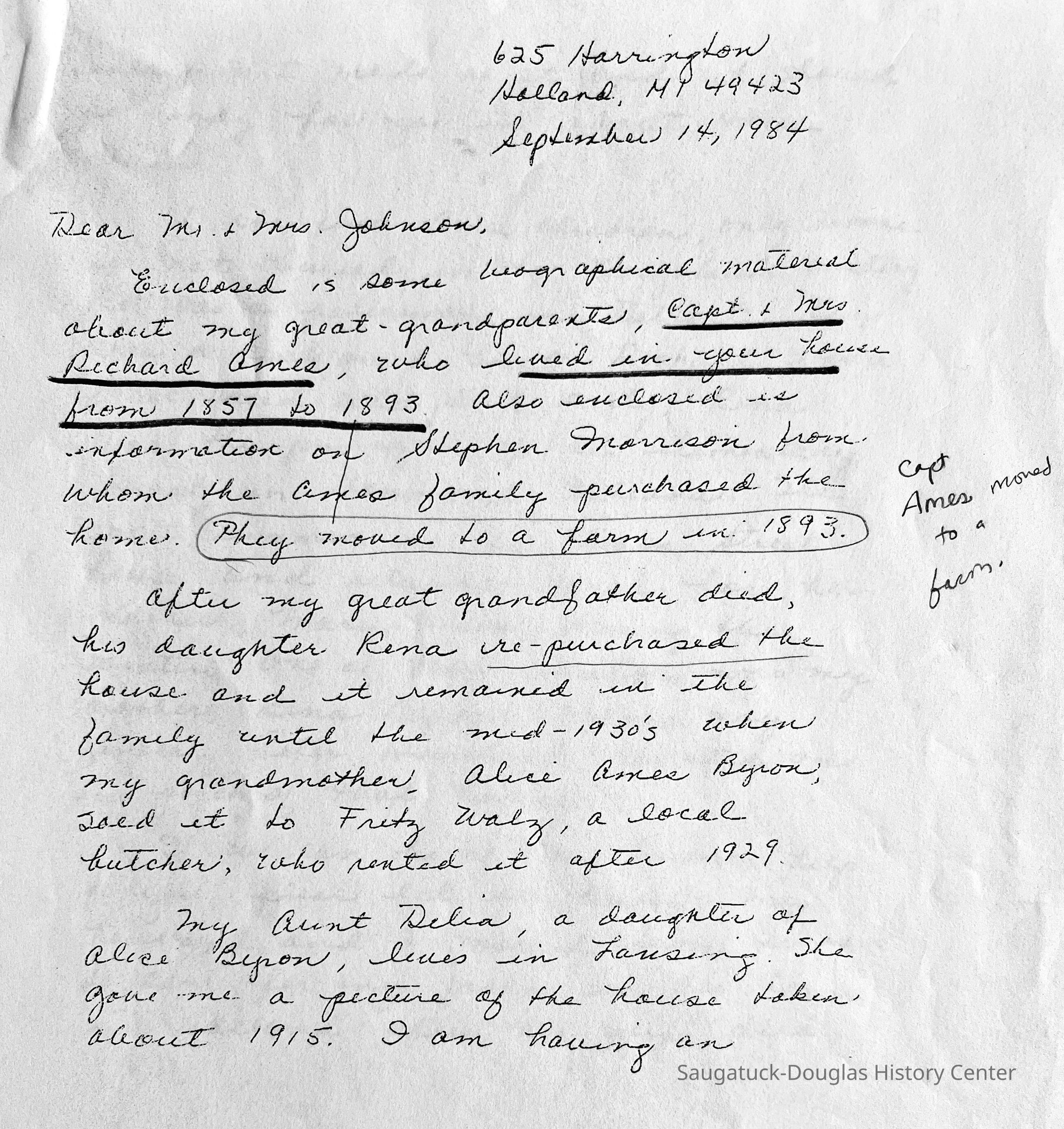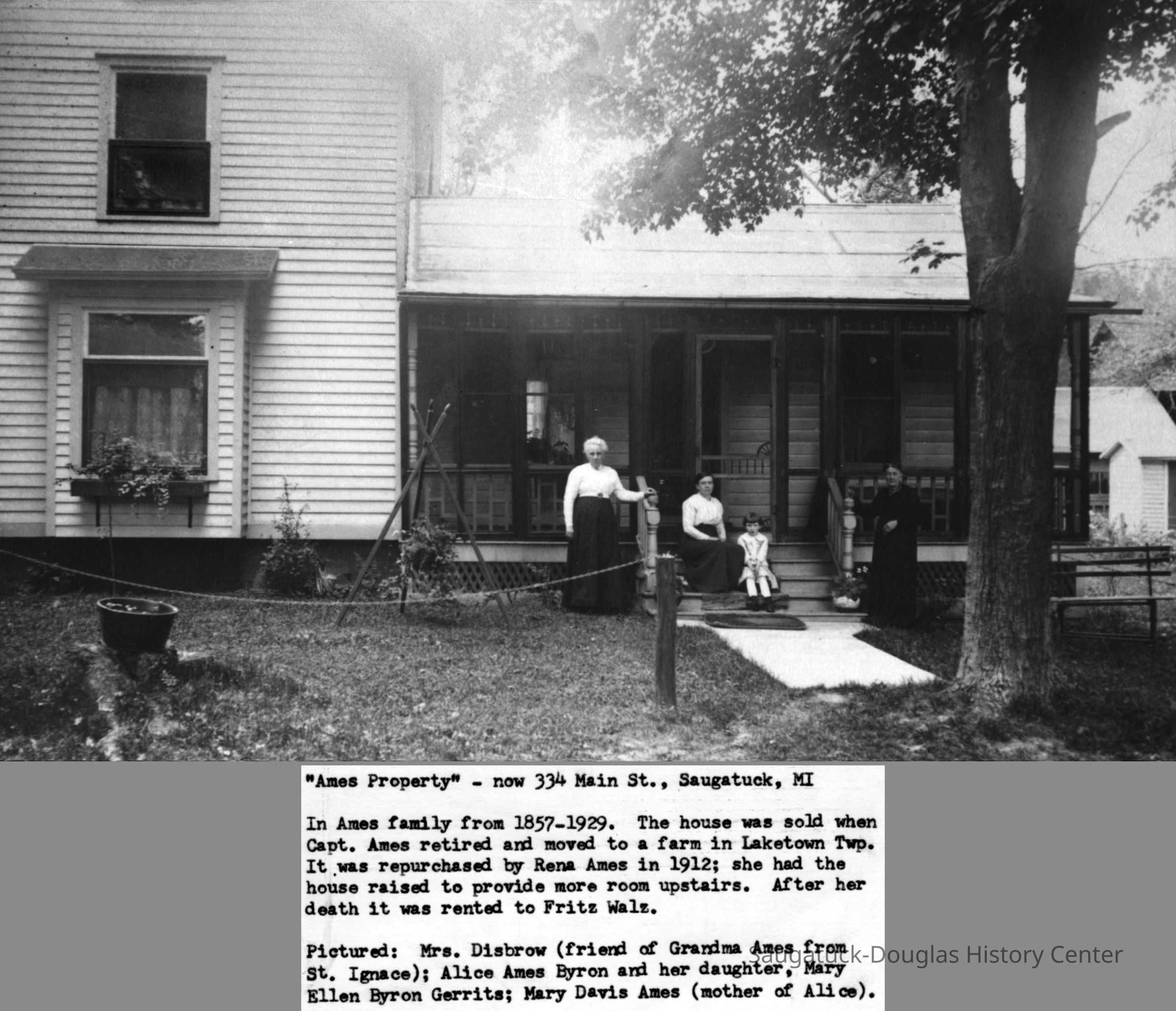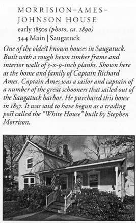 Source: SDHS newsletter pg. 276-278 Visiting Grandma Ames and Aunt Rena [Barry Johnson, in researching his house, received a letter written some time ago by Mary (Byron) Genrits that refers to the Saugatuck house on the hill on Main Street when it was owned by the Ames family. Here are excerpts of local historical interest] Grandma and Grandpa Ames came from Ganges to Saugatuck. I believe they floated some of their furniture on the Kalamazoo river. There were a lot of stray Indians in the territory. Several tribes were mentioned by Mr. Sheridan who wrote Saugatuck Through the Years, 1830 to 1980. The Pottawattamies were mentioned and the Ottawas mostly, but there were a string of others I never hear of. Why am I talking about Indians? They sneak into my thoughts. When Grandma and Grandpa Ames and family moved into the house on the hill, I don't know if they rented it or how long they stayed, it was a one story house. The living room area or parlor as it was called, was a saloon for the Indians. I don't know how long they stayed there but they bought some farming property. A Mr. Comstock who came from the east bought property all around that area but finally settled down to be a gentleman farmer near the end of the 19th century and later sold the farm to the famous Belvedere farms (from Mr. Sheridan's book). The Comstock family was across from Grandpa's farm. Mother met Dad while he was working at the Comstock farm. Now we come to my grandmother Mary Ellen Davis Ames (Mrs. Richard Ames). Grandfather named me after her. When I was 16 we found out my father's mother's name was Mary Ellen. I always thought they were still on the farm when he died in 1910. I was a year old. I'm not sure as to the date they left the farm and bought back the Saugatuck house. I distinctly remember when I was quite small (4 or 5, 1912 or 1913) of standing on the east side of the house with a group of people. I stood close to Mother. There was Grandma, Aunt Rena and Mrs. Grenaugh (probably, Mrs. Greenhalgh) who lived on the east side of Grandma, next door. There was a lot of activity. They added on to the east side kitchen porch, put up a roof and added a window to the linen closet which they enlarged when attaching the wood shed. They added the coal and wood bins. There was a window on the west side of the shed (today we call it a utility room). That room was not finished on the inside, just the 2 x 4's and siding. There was a door at the back that led to the 2 holer at the foot of the stairs. They removed the privy from the garden end of the plot. I can see Aunt Rena now planting a rose bush trellis in back of the privy. They raised the roof on the main part of the house and put a stairway in a small room behind the parlor. We called it the library as there were several cabinets of books. At the bottom of the stair case was a large turkey red upholstered chair with carved ends on both arms. Delia got that chair and she told me that Stan had it now. I used to sit there and day dream when I was around 6 or 7 visiting Grandma. I really loved the old chair and I'd sit and read and day dream for hours. When I lived with Aunt Rena for 2 summers when I was 16 or 17 and worked at Parish's Drug Store, behind the soda fountain, I earned $15 a week. Same as my father made at the Interurban office. Aunt Rena saved my salary and gave it to father. It paid for my school books, etc. When I was 6 I stayed with Grandma for several days and on one of the evenings she took me to a church social banquet at the Butler Hotel. Mrs. Huff, the wife of the hardware store owner, and her daughter, my age, attended too. I wasn't feeling very well, coming down with a cold. Grandma bought me rock candy for the cold. Of course at the banquet I played with the Huff girl. It so happened that the cold was the forerunner of the measles and the Huff girl caught them from me. The outcome was Mrs. Huff was so angry she wouldn't speak to Grandmother from then on. Grandmother used to take me to visit her friends. Two of them were Mr. & Mrs. Aliber. He owned a grocery store on Main Street at the foot of the hill that Grandma lived on. They lived above the store. I remember they had so many pretty glass vases etc. Mrs. Aliber died. They had one son, a good looking boy. Aunt Rena was only home during spring break and summer vacation when schools were closed. She supported Grandma. She put a certain amount in the bank for Grandma to draw on. Grandma had a lady friend, Mrs. Kantner, who stayed with her one winter and I guess after Mrs. Aliber died they visited Mr. Aliber frequently taking him fresh baked cookies and bread. I guess one winter they baked up a storm, bringing baked goods to friends. They went through a lot of Grandma's account, which Aunt Rena stopped. Aunt Rena was afraid Grandma had designs on Mr. Aliber. If she did they came to naught. When Grandma started ailing, she came to Holland and stayed with us, where she died in 1918. I was 9 years old. Aunt Rena inherited Grandma's estate. She lived there every summer except when she took trips and went to summer school in Battle Creek. I remember we went to visit her there. During the holidays she came to stay with us. It was always exciting expecting her to arrive by train. Mother's and Aunt Rena's cousin, Clarence Davis from Ganges, came to see us every summer. He had an apple orchard in Ganges and in the winter he lived in Alabama where he had a pecan grove. When he came back to Ganges he always bought us a big bag of pecans. Boy, those were good. During the summer he brought us apples from the Ganges farm. I liked the white sweet ones we got during the summer. Mother had a friend, Delis Pride. In fact Mrs. Pride and her sister Mrs. Whipple were very good friends of the family, especially Mrs. Pride. We called her Aunt Dee. My sister Delis was named after her. They owned a summer hotel in Saugatuck. I remember one spring break when Aunt Rena came to Holland and took me to Saugatuck for a day t